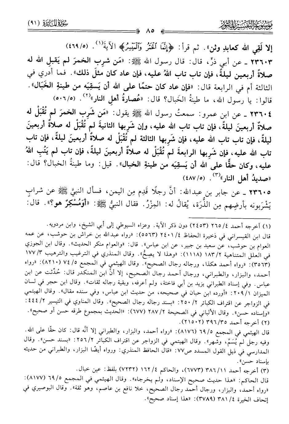 ٢٣٦٠٣ - عن أبي ذرٍّ، قال: قال رسول الله - صلى الله عليه وسلم -: «مَن شرِب الخمرَ لم يَقبلِ الله له صلاةً أربعين ليلةً، فإن تاب تاب اللهُ عليه، فإن عاد كان مثلَ ذلك». فما أدري في الثالثة أم في الرابعة قال: «فإن عاد كان حتمًا على الله أن يَسقِيَه من طينةِ الخَبال». قالوا: يا رسول الله، ما طينةُ الخَبال؟ قال: «عُصارةُ أهلِ النار» (¬٢). (٥/ ٥٠٦)