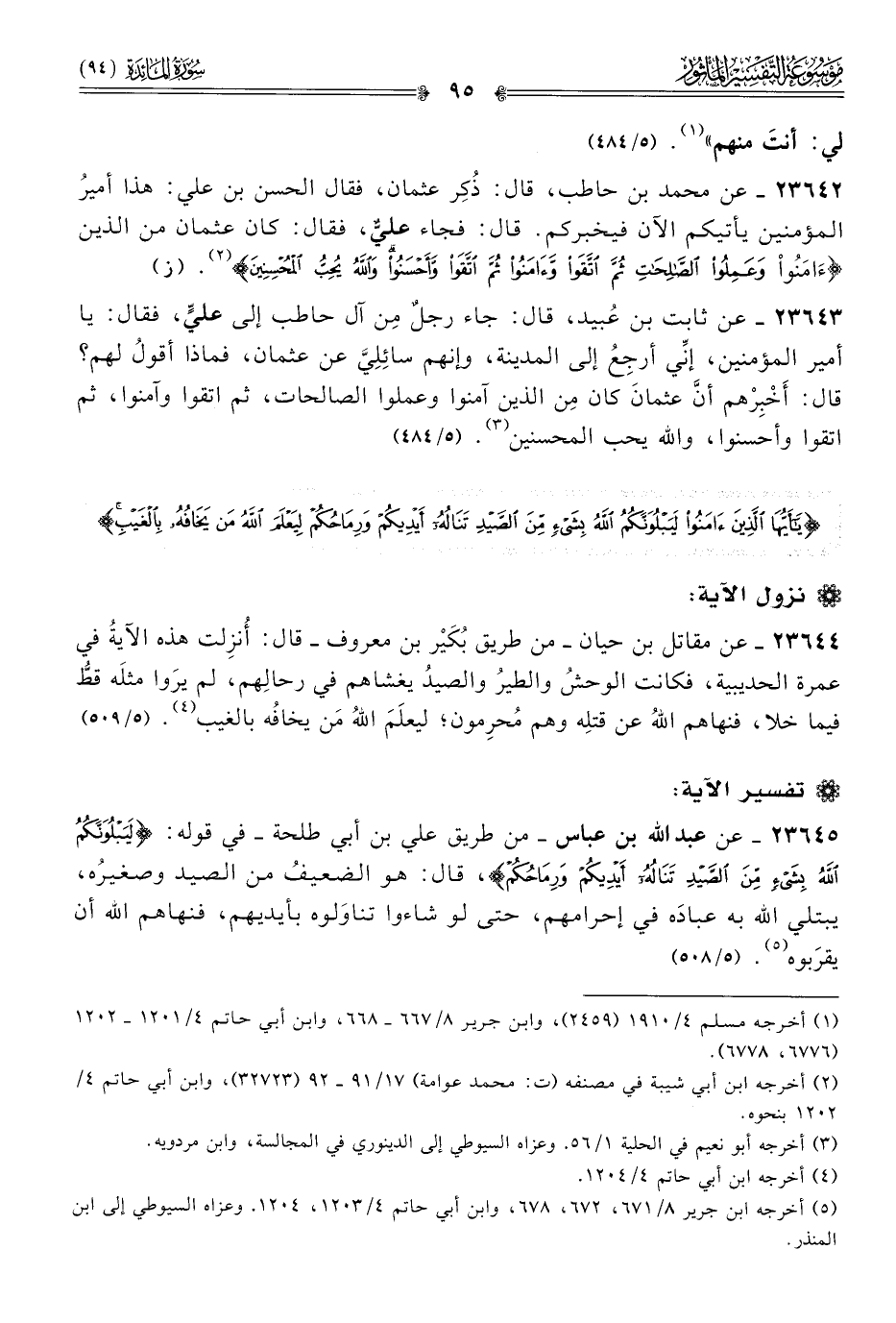 ٢٣٦٤٥ - عن عبد الله بن عباس -من طريق علي بن أبي طلحة- في قوله: {ليبلونكم الله بشيء من الصيد تناله أيديكم ورماحكم}، قال: هو الضعيفُ من الصيد وصغيرُه، يبتلي الله به عبادَه في إحرامهم، حتى لو شاءوا تناوَلوه بأيديهم، فنهاهم الله أن يقرَبوه (¬٥). (٥/ ٥٠٨)
