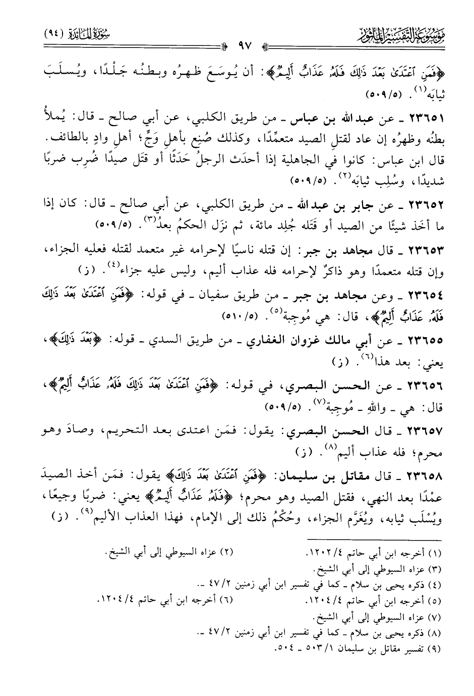 ٢٣٦٥١ - عن عبد الله بن عباس -من طريق الكلبي، عن أبي صالح- قال: يُملأُ بطنُه وظهرُه إن عاد لقتلِ الصيد متعمِّدًا، وكذلك صُنِع بأهلِ وجٍّ؛ أهلِ وادٍ بالطائف. قال ابن عباس: كانوا في الجاهلية إذا أحدَث الرجلُ حَدَثًا أو قتَل صيدًا ضُرِب ضربًا شديدًا، وسُلِب ثيابَه (¬٢). (٥/ ٥٠٩)