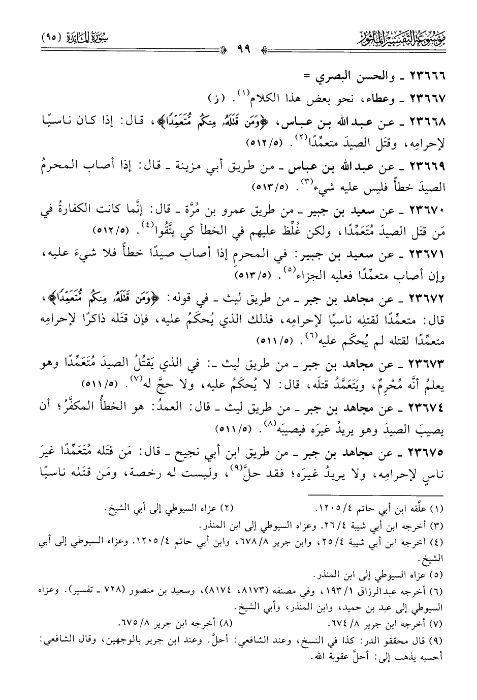 ٢٣٦٦٨ - عن عبد الله بن عباس، {ومن قتله منكم متعمدا}، قال: إذا كان ناسيًا لإحرامِه، وقتَل الصيدَ متعمِّدًا (¬٢). (٥/ ٥١٢)