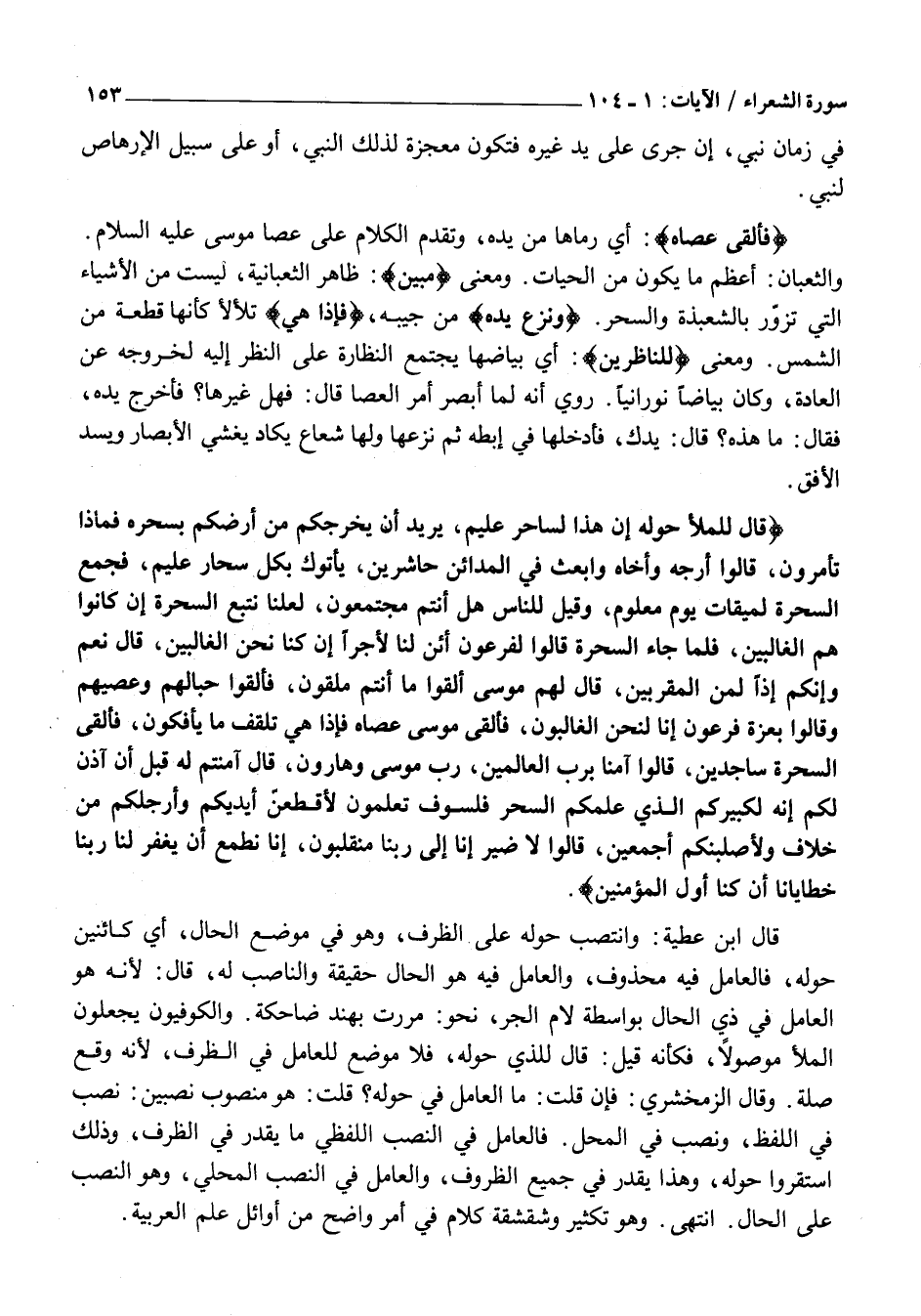 قالَ لِلْمَلَإِ حَوْلَهُ إِنَّ هَذَا لَساحِرٌ عَلِيمٌ، يُرِيدُ أَنْ يُخْرِجَكُمْ مِنْ أَرْضِكُمْ بِسِحْرِهِ فَماذا تَأْمُرُونَ، قالُوا أَرْجِهْ وَأَخاهُ وَابْعَثْ فِي الْمَدائِنِ حاشِرِينَ، يَأْتُوكَ بِكُلِّ سَحَّارٍ عَلِيمٍ، فَجُمِعَ السَّحَرَةُ لِمِيقاتِ يَوْمٍ مَعْلُومٍ، وَقِيلَ لِلنَّاسِ هَلْ أَنْتُمْ مُجْتَمِعُونَ، لَعَلَّنا نَتَّبِعُ السَّحَرَةَ إِنْ كانُوا هُمُ الْغالِبِينَ، فَلَمَّا جاءَ السَّحَرَةُ قالُوا لِفِرْعَوْنَ أَإِنَّ لَنا لَأَجْراً إِنْ كُنَّا نَحْنُ الْغالِبِينَ، قالَ نَعَمْ وَإِنَّكُمْ إِذاً لَمِنَ الْمُقَرَّبِينَ، قالَ لَهُمْ مُوسى أَلْقُوا مَا أَنْتُمْ مُلْقُونَ، فَأَلْقَوْا حِبالَهُمْ وَعِصِيَّهُمْ وَقالُوا بِعِزَّةِ فِرْعَوْنَ إِنَّا لَنَحْنُ الْغالِبُونَ، فَأَلْقى مُوسى عَصاهُ فَإِذا هِيَ تَلْقَفُ مَا يَأْفِكُونَ، فَأُلْقِيَ السَّحَرَةُ ساجِدِينَ، قالُوا آمَنَّا بِرَبِّ الْعالَمِينَ، رَبِّ مُوسى وَهارُونَ، قالَ آمَنْتُمْ لَهُ قَبْلَ أَنْ آذَنَ لَكُمْ إِنَّهُ لَكَبِيرُكُمُ الَّذِي عَلَّمَكُمُ السِّحْرَ فَلَسَوْفَ تَعْلَمُونَ لَأُقَطِّعَنَّ أَيْدِيَكُمْ وَأَرْجُلَكُمْ مِنْ خِلافٍ وَلَأُصَلِّبَنَّكُمْ أَجْمَعِينَ، قالُوا لَا ضَيْرَ إِنَّا إِلى رَبِّنا مُنْقَلِبُونَ، إِنَّا نَطْمَعُ أَنْ يَغْفِرَ لَنا رَبُّنا خَطايانا أَنْ كُنَّا أَوَّلَ الْمُؤْمِنِينَ.