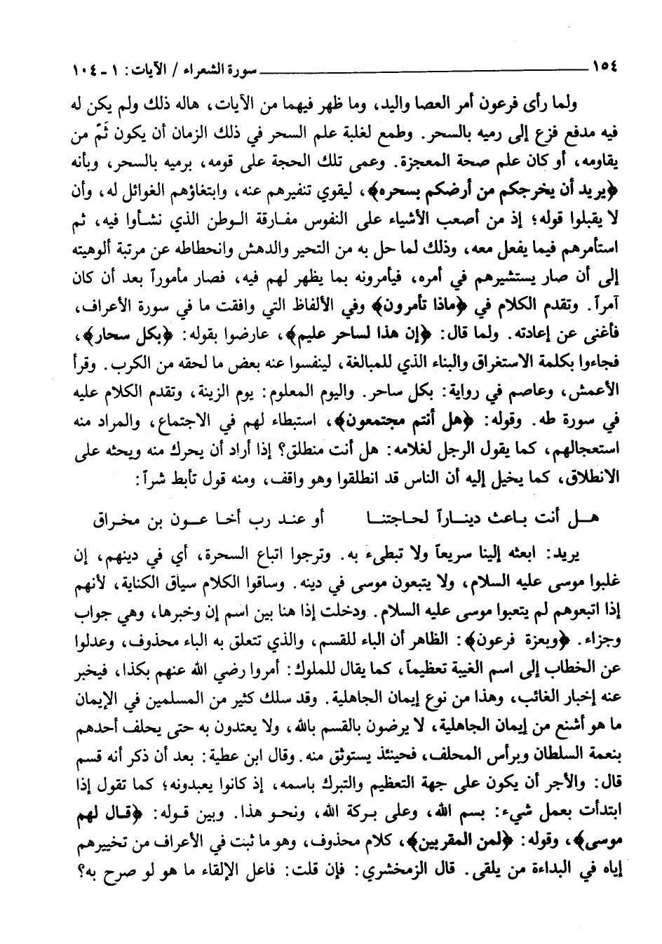 يُرِيدُ: ابْعَثْهُ إِلَيْنَا سَرِيعًا وَلَا تُبْطِئُ بِهِ. وَتَرَجَّوُا اتِّبَاعَ السَّحَرَةِ، أَيْ فِي دِينِهِمْ، إِنْ غَلَبُوا مُوسَى عَلَيْهِ السَّلَامُ، وَلَا يَتَّبِعُونَ مُوسَى فِي دِينِهِ. وَسَاقُوا الْكَلَامَ سِيَاقَ الْكِنَايَةِ، لِأَنَّهُمْ إِذَا اتَّبَعُوهُمْ لَمْ يَتَّبِعُوا مُوسَى عَلَيْهِ السَّلَامُ. وَدَخَلَتْ إِذَا هُنَا بَيْنَ اسْمِ إِنَّ وَخَبَرِهَا، وَهِيَ جَوَابٌ وَجَزَاءٌ. وبِعِزَّةِ فِرْعَوْنَ: الظَّاهِرُ أَنَّ الْبَاءَ لِلْقَسَمِ، وَالَّذِي تَتَعَلَّقُ بِهِ الْبَاءُ مَحْذُوفٌ، وَعَدَلُوا عَنِ الْخِطَابِ إِلَى اسْمِ الْغَيْبَةِ تَعْظِيمًا، كَمَا يُقَالُ لِلْمُلُوكِ: أَمَرُوا رَضِيَ اللَّهُ عَنْهُمْ بِكَذَا، فَيُخْبِرُ عَنْهُ إِخْبَارَ الْغَائِبِ، وَهَذَا مِنْ نَوْعِ إِيمَانِ الْجَاهِلِيَّةِ. وَقَدْ سَلَكَ كَثِيرٌ مِنَ الْمُسْلِمِينَ فِي الْإِيمَانِ مَا هُوَ أَشْنَعُ مِنْ إِيمَانِ الْجَاهِلِيَّةِ، لَا يَرْضَوْنَ بِالْقَسَمِ بِاللَّهِ، وَلَا يَعْتَدُّونَ بِهِ حَتَّى يَحْلِفَ أَحَدُهُمْ بِنِعْمَةِ السُّلْطَانِ وَبِرَأْسِ الْمُحَلِّفِ، فَحِينَئِذٍ يُسْتَوْثَقُ مِنْهُ. وَقَالَ ابْنُ عَطِيَّةَ: بَعْدَ أَنْ ذَكَرَ أَنَّهُ قَسَمٌ قَالَ: وَالْأَجْرُ أَنْ يَكُونَ عَلَى جِهَةِ التَّعْظِيمِ وَالتَّبَرُّكِ بِاسْمِهِ، إِذْ كَانُوا يَعْبُدُونَهُ كَمَا تَقُولُ إِذَا ابْتَدَأْتَ بِعَمَلِ شَيْءٍ: بِسْمِ اللَّهِ، وَعَلَى بَرَكَةِ اللَّهِ، وَنَحْوَ هَذَا. وَبَيْنَ قَوْلِهِ: قالَ لَهُمْ مُوسى، وَقَوْلُهُ: لَمِنَ الْمُقَرَّبِينَ، كَلَامٌ مَحْذُوفٌ، وَهُوَ مَا ثَبَتَ فِي الْأَعْرَافِ مِنْ تَخْيِيرِهِمْ إِيَّاهُ فِي الْبَدَاءَةِ مَنْ يُلْقِي. قَالَ الزَّمَخْشَرِيُّ: فَإِنْ قُلْتَ: فَاعِلُ الْإِلْقَاءِ مَا هُوَ لَوْ صَرَّحَ بِهِ؟