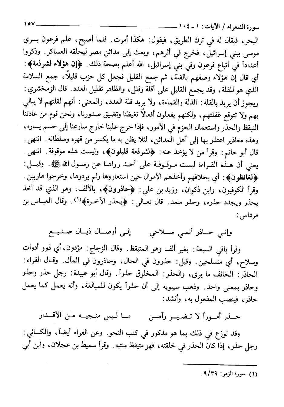 وَقَرَأَ الْكُوفِيُّونَ، وَابْنُ ذَكْوَانَ، وَزَيْدُ بْنُ عَلِيٍّ: حاذِرُونَ، بِالْأَلِفِ، وَهُوَ الَّذِي قَدْ أَخَذَ يَحْذَرُ وَيُجَدِّدُ حَذَرَهُ، وَحَذَرَ مُتَعَدٍّ. قَالَ تَعَالَى: يَحْذَرُ الْآخِرَةَ «1» . وَقَالَ الْعَبَّاسُ بْنُ مِرْدَاسٍ: