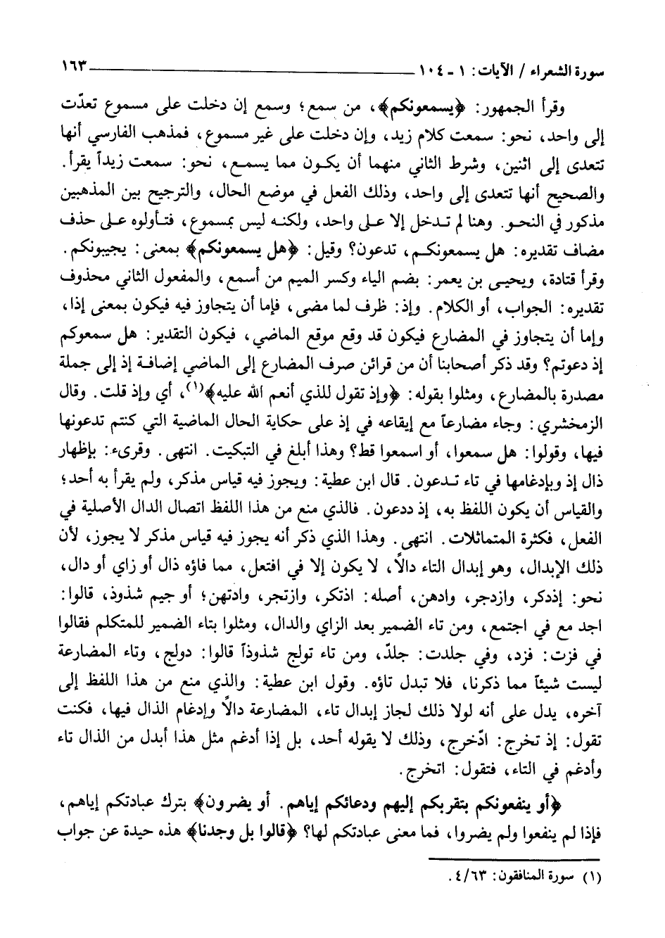 وَالصَّحِيحُ أَنَّهَا تَتَعَدَّى إِلَى وَاحِدٍ، وَذَلِكَ الْفِعْلَ فِي مَوْضِعِ الْحَالِ، وَالتَّرْجِيحُ بَيْنَ الْمَذْهَبَيْنِ مَذْكُورٌ فِي النَّحْوِ. وَهُنَا لَمْ تَدْخُلْ إِلَّا عَلَى وَاحِدٍ، وَلَكِنَّهُ لَيْسَ بِمَسْمُوعٍ، فَتَأَوَّلُوهُ عَلَى حَذْفِ مُضَافٍ تَقْدِيرُهُ: هَلْ يَسْمَعُونَكُمْ، تَدْعُونَ؟ وَقِيلَ: هَلْ يَسْمَعُونَكُمْ بِمَعْنَى: يُجِيبُونَكُمْ.
