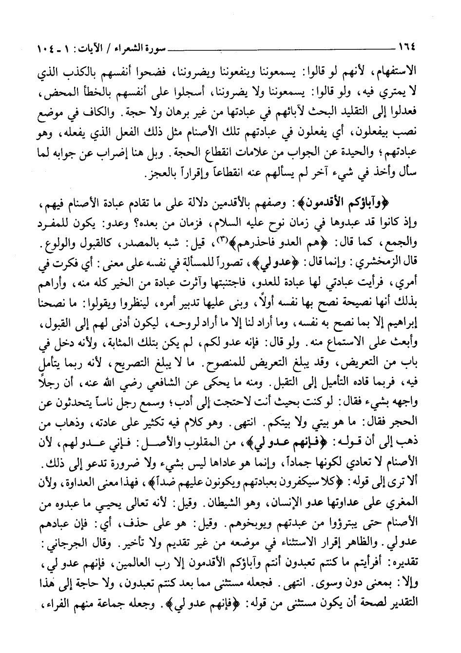 تَقْدِيرُهُ: أَفَرَأَيْتُمْ مَا كُنْتُمْ تَعْبُدُونَ أَنْتُمْ وَآبَاؤُكُمُ الْأَقْدَمُونَ إِلَّا رَبَّ الْعَالَمِينَ، فَإِنَّهُمْ عَدُوٌّ لِي، وَإِلَّا: بِمَعْنَى دُونَ وَسِوَى. انْتَهَى. فَجَعَلَهُ مُسْتَثْنًى مِمَّا بَعْدَ كُنْتُمْ تَعْبُدُونَ، وَلَا حَاجَةَ إِلَى هَذَا التَّقْدِيرِ لِصِحَّةِ أَنْ يَكُونَ مُسْتَثْنًى مِنْ قَوْلِهِ: فَإِنَّهُمْ عَدُوٌّ لِي. وَجَعَلَهُ جَمَاعَةٌ مِنْهُمِ الْفَرَّاءُ،