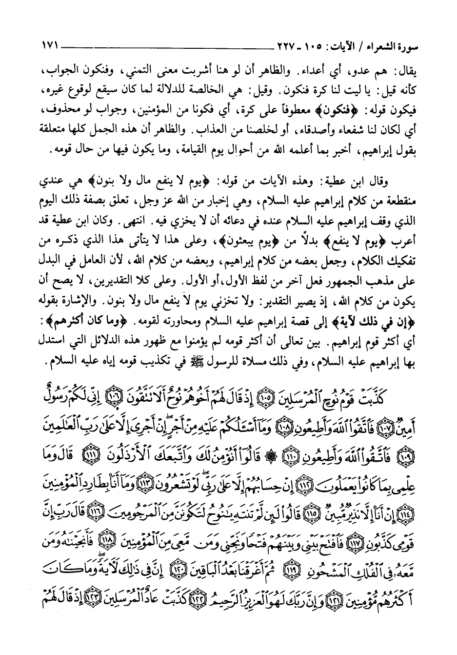 وَقَالَ ابْنُ عَطِيَّةَ: وَهَذِهِ الْآيَاتُ مِنْ قَوْلِهِ: يَوْمَ لَا يَنْفَعُ مالٌ وَلا بَنُونَ هِيَ عِنْدِي مُنْقَطِعَةٌ مِنْ كَلَامِ إِبْرَاهِيمَ عَلَيْهِ السَّلَامُ، وَهِيَ أَخْبَارٌ مِنَ اللَّهِ عَزَّ وَجَلَّ، تَعَلَّقَ بِصِفَةِ ذَلِكَ الْيَوْمِ الَّذِي وَقَفَ إِبْرَاهِيمُ عَلَيْهِ السَّلَامُ عِنْدَهُ فِي دُعَائِهِ أَنْ لَا يُخْزَى فِيهِ. انْتَهَى. وَكَأَنَّ ابْنَ عَطِيَّةَ قَدْ أَعْرَبَ يَوْمَ لَا يَنْفَعُ بدلا من يَوْمَ يُبْعَثُونَ، وَعَلَى هَذَا لَا يَتَأَتَّى هَذَا الَّذِي ذَكَرَهُ مِنْ تَفْكِيكِ الْكَلَامِ، وَجَعْلِ بَعْضِهِ مِنْ كَلَامِ إِبْرَاهِيمَ، وَبَعْضُهُ مِنْ كَلَامِ اللَّهِ، لِأَنَّ الْعَامِلَ فِي الْبَدَلِ عَلَى مَذْهَبِ الْجُمْهُورِ فِعْلٌ آخَرُ مِنْ لَفْظِ الْأَوَّلِ، أَوِ الْأَوَّلُ. وَعَلَى كِلَا التَّقْدِيرَيْنِ، لَا يَصِحُّ أَنْ يَكُونَ مِنْ كَلَامِ اللَّهِ، إِذْ يَصِيرُ التَّقْدِيرُ: وَلَا تُخْزِنِي يَوْمَ لَا يَنْفَعُ مَالٌ وَلَا بَنُونَ. وَالْإِشَارَةُ بِقَوْلِهِ إِنَّ فِي ذلِكَ لَآيَةً إِلَى قِصَّةِ إِبْرَاهِيمَ عَلَيْهِ السَّلَامُ وَمُحَاوَرَتِهِ لِقَوْمِهِ. وَما كانَ أَكْثَرُهُمْ: