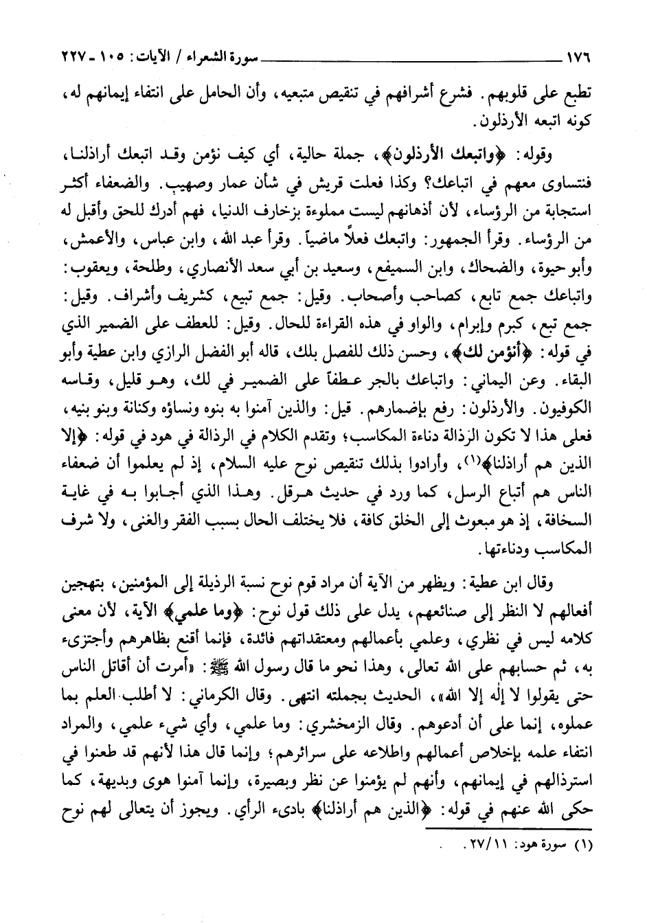 وَقَوْلُهُ: وَاتَّبَعَكَ الْأَرْذَلُونَ، جُمْلَةٌ حَالِيَّةٌ، أَيْ كَيْفَ نُؤْمِنُ وَقَدِ اتَّبَعَكَ أَرَاذِلُنَا، فَنَتَسَاوَى مَعَهُمْ فِي اتِّبَاعِكَ؟ وَكَذَا فَعَلَتْ قُرَيْشٌ فِي شَأْنِ عَمَّارٍ وَصُهَيْبٍ. وَالضُّعَفَاءُ أَكْثَرُ اسْتِجَابَةً مِنَ الرُّؤَسَاءِ، لِأَنَّ أَذْهَانَهُمْ لَيْسَتْ مَمْلُوءَةً بِزَخَارِفِ الدُّنْيَا، فَهُمْ أَدْرَكُ لِلْحَقِّ وَأَقْبَلُ لَهُ مِنَ الرُّؤَسَاءِ. وَقَرَأَ الْجُمْهُورُ: وَاتَّبَعَكَ فِعْلًا مَاضِيًا. وَقَرَأَ عَبْدُ اللَّهِ، وَابْنُ عَبَّاسٍ، وَالْأَعْمَشُ، وَأَبُو حَيْوَةَ، وَالضَّحَّاكُ، وَابْنُ السَّمَيْفَعِ، وَسَعِيدُ بْنُ أَبِي سَعْدٍ الْأَنْصَارِيُّ، وَطَلْحَةُ، وَيَعْقُوبُ: