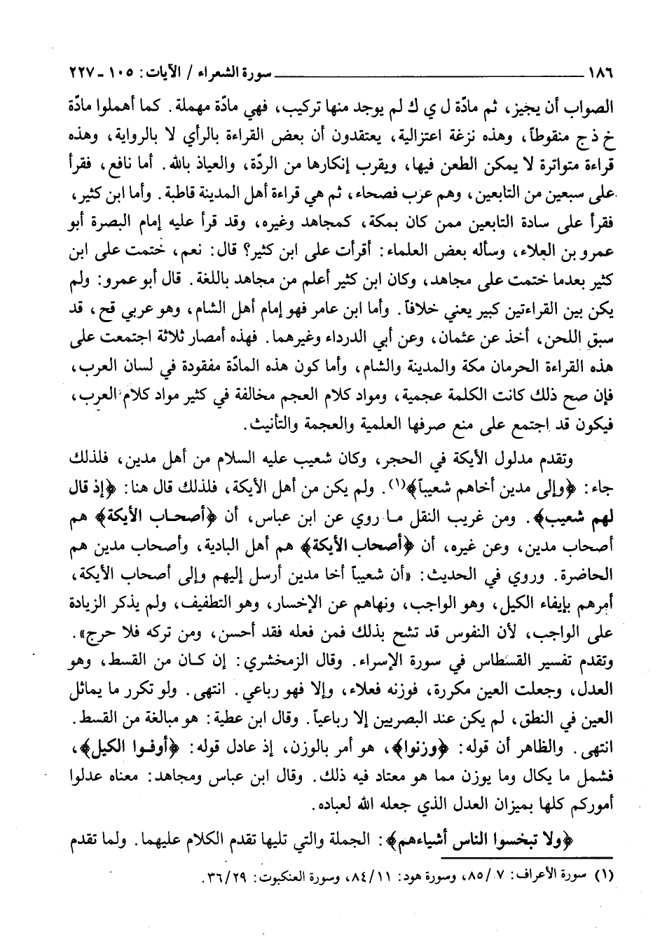 الصَّوَابُ أَنْ يُجِيزَ، ثُمَّ مَادَّةُ ل ي ك لَمْ يُوجَدْ مِنْهَا تَرْكِيبٌ، فَهِيَ مَادَّةٌ مُهْمَلَةٌ. كَمَا أَهْمَلُوا مَادَّةَ خ ذ ج مَنْقُوطًا، وَهَذِهِ نَزْغَةٌ اعْتِزَالِيَّةٌ، يَعْتَقِدُونَ أَنَّ بَعْضَ الْقِرَاءَةِ بِالرَّأْيِ لَا بِالرِّوَايَةِ، وَهَذِهِ قِرَاءَةٌ مُتَوَاتِرَةٌ لَا يُمْكِنُ الطَّعْنُ فِيهَا، وَيَقْرُبُ إِنْكَارُهَا مِنَ الرِّدَّةِ، وَالْعِيَاذُ بِاللَّهِ. أَمَّا نَافِعٌ، فَقَرَأَ عَلَى سَبْعِينَ مِنَ التَّابِعِينَ، وَهُمْ عَرَبٌ فُصَحَاءُ، ثُمَّ هي قِرَاءَةُ أَهْلِ الْمَدِينَةِ قَاطِبَةً. وَأَمَّا ابْنُ كَثِيرٍ، فَقَرَأَ عَلَى سَادَةِ التَّابِعِينَ مِمَّنْ كَانَ بِمَكَّةَ، كَمُجَاهِدٍ وَغَيْرِهِ، وَقَدْ قَرَأَ عَلَيْهِ إِمَامُ الْبَصْرَةِ أَبُو عَمْرِو بْنُ الْعَلَاءِ، وَسَأَلَهُ بَعْضُ الْعُلَمَاءِ: أَقَرَأْتَ عَلَى ابْنِ كَثِيرٍ؟ قَالَ: نَعَمْ، خَتَمْتُ عَلَى ابن كثير بعد ما خَتَمْتُ عَلَى مُجَاهِدٍ، وَكَانَ ابْنُ كَثِيرٍ أَعْلَمَ مِنْ مُجَاهِدٍ بِاللُّغَةِ. قَالَ أَبُو عَمْرٍو: وَلَمْ يَكُنْ بَيْنَ الْقِرَاءَتَيْنِ كَبِيرٌ يَعْنِي خِلَافًا. وَأَمَّا ابْنُ عَامِرٍ فَهُوَ إِمَامُ أَهْلِ الشَّامِ، وَهُوَ عَرَبِيٌّ قُحٌّ، قَدْ سَبَقَ اللَّحْنَ، أَخَذَ عَنْ عُثْمَانَ، وَعَنْ أَبِي الدَّرْدَاءِ وَغَيْرِهِمَا. فَهَذِهِ أَمْصَارٌ ثَلَاثَةٌ اجْتَمَعَتْ عَلَى هَذِهِ الْقِرَاءَةِ الْحَرَمَانِ مَكَّةُ وَالْمَدِينَةُ وَالشَّامُ، وَأَمَّا كَوْنُ هَذِهِ الْمَادَّةِ مَفْقُودَةً فِي لِسَانِ الْعَرَبِ، فَإِنْ صَحَّ ذَلِكَ كَانَتِ الْكَلِمَةُ عَجَمِيَّةً، وَمَوَادُّ كَلَامِ الْعَجَمِ مُخَالِفَةٌ فِي كَثِيرٍ مَوَادَّ كَلَامِ الْعَرَبِ، فَيَكُونُ قَدِ اجْتَمَعَ عَلَى مَنْعِ صَرْفِهَا الْعَلَمِيَّةُ وَالْعُجْمَةُ وَالتَّأْنِيثُ.