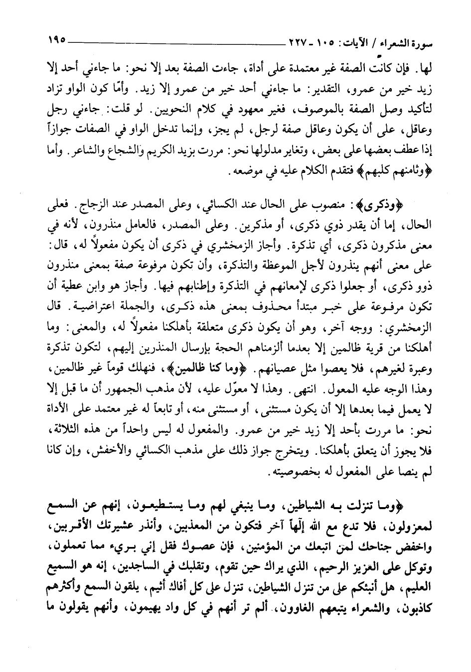 وَما تَنَزَّلَتْ بِهِ الشَّياطِينُ، وَما يَنْبَغِي لَهُمْ وَما يَسْتَطِيعُونَ، إِنَّهُمْ عَنِ السَّمْعِ لَمَعْزُولُونَ، فَلا تَدْعُ مَعَ اللَّهِ إِلهاً آخَرَ فَتَكُونَ مِنَ الْمُعَذَّبِينَ، وَأَنْذِرْ عَشِيرَتَكَ الْأَقْرَبِينَ، وَاخْفِضْ جَناحَكَ لِمَنِ اتَّبَعَكَ مِنَ الْمُؤْمِنِينَ، فَإِنْ عَصَوْكَ فَقُلْ إِنِّي بَرِيءٌ مِمَّا تَعْمَلُونَ، وَتَوَكَّلْ عَلَى الْعَزِيزِ الرَّحِيمِ، الَّذِي يَراكَ حِينَ تَقُومُ، وَتَقَلُّبَكَ فِي السَّاجِدِينَ، إِنَّهُ هُوَ السَّمِيعُ الْعَلِيمُ، هَلْ أُنَبِّئُكُمْ عَلى مَنْ تَنَزَّلُ الشَّياطِينُ، تَنَزَّلُ عَلى كُلِّ أَفَّاكٍ أَثِيمٍ، يُلْقُونَ السَّمْعَ وَأَكْثَرُهُمْ كاذِبُونَ، وَالشُّعَراءُ يَتَّبِعُهُمُ الْغاوُونَ، أَلَمْ تَرَ أَنَّهُمْ فِي كُلِّ وادٍ يَهِيمُونَ، وَأَنَّهُمْ يَقُولُونَ مَا