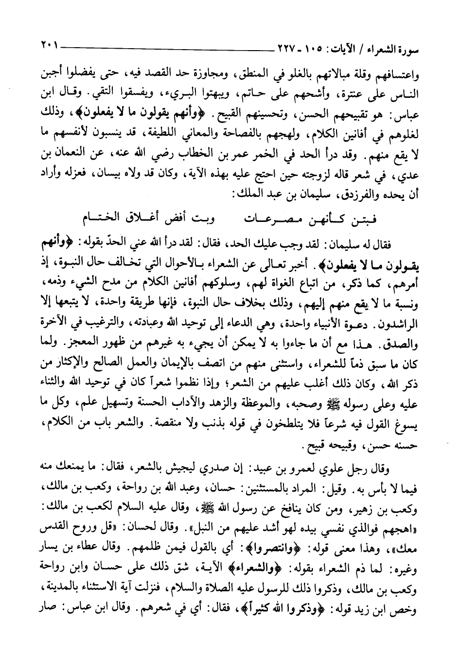وَاعْتِسَافِهِمْ وَقِلَّةِ مُبَالَاتِهِمْ بِالْغُلُوِّ فِي الْمَنْطِقِ، وَمُجَاوَزَةِ حَدِّ الْقَصْدِ فِيهِ، حَتَّى يُفَضِّلُوا أَجْبَنَ النَّاسِ عَلَى عَنْتَرَةَ، وَأَشَحَّهُمْ عَلَى حَاتِمٍ، وَيُبْهِتُوا الْبَرِيءَ، وَيُفَسِّقُوا التَّقِيَّ. وَقَالَ ابْنُ عَبَّاسٍ: هُوَ تَقْبِيحُهُمِ الْحَسَنَ، وَتَحْسِينُهُمُ الْقَبِيحَ. وَأَنَّهُمْ يَقُولُونَ مَا لَا يَفْعَلُونَ، وَذَلِكَ لِغُلُوِّهِمْ فِي أَفَانِينِ الْكَلَامِ، وَلَهْجِهِمْ بِالْفَصَاحَةِ وَالْمَعَانِي اللَّطِيفَةِ، قَدْ يَنْسُبُونَ لِأَنْفُسِهِمْ ما لا يقع منهم. وَقَدْ دَرَأَ الْحَدَّ فِي الْخَمْرِ عُمَرُ بْنُ الْخَطَّابِ رَضِيَ الله عنه، عن النُّعْمَانِ بْنِ عَدِيٍّ، فِي شِعْرٍ قَالَهُ لِزَوْجَتِهِ حِينَ احْتَجَّ عَلَيْهِ بِهَذِهِ الْآيَةِ، وَكَانَ قَدِ وَلَّاهُ بِيسَانَ، فَعَزَلَهُ وَأَرَادَ أَنْ يَحُدَّهُ والفرزدق، سُلَيْمَانُ بْنُ عَبْدِ الْمَلِكِ:
