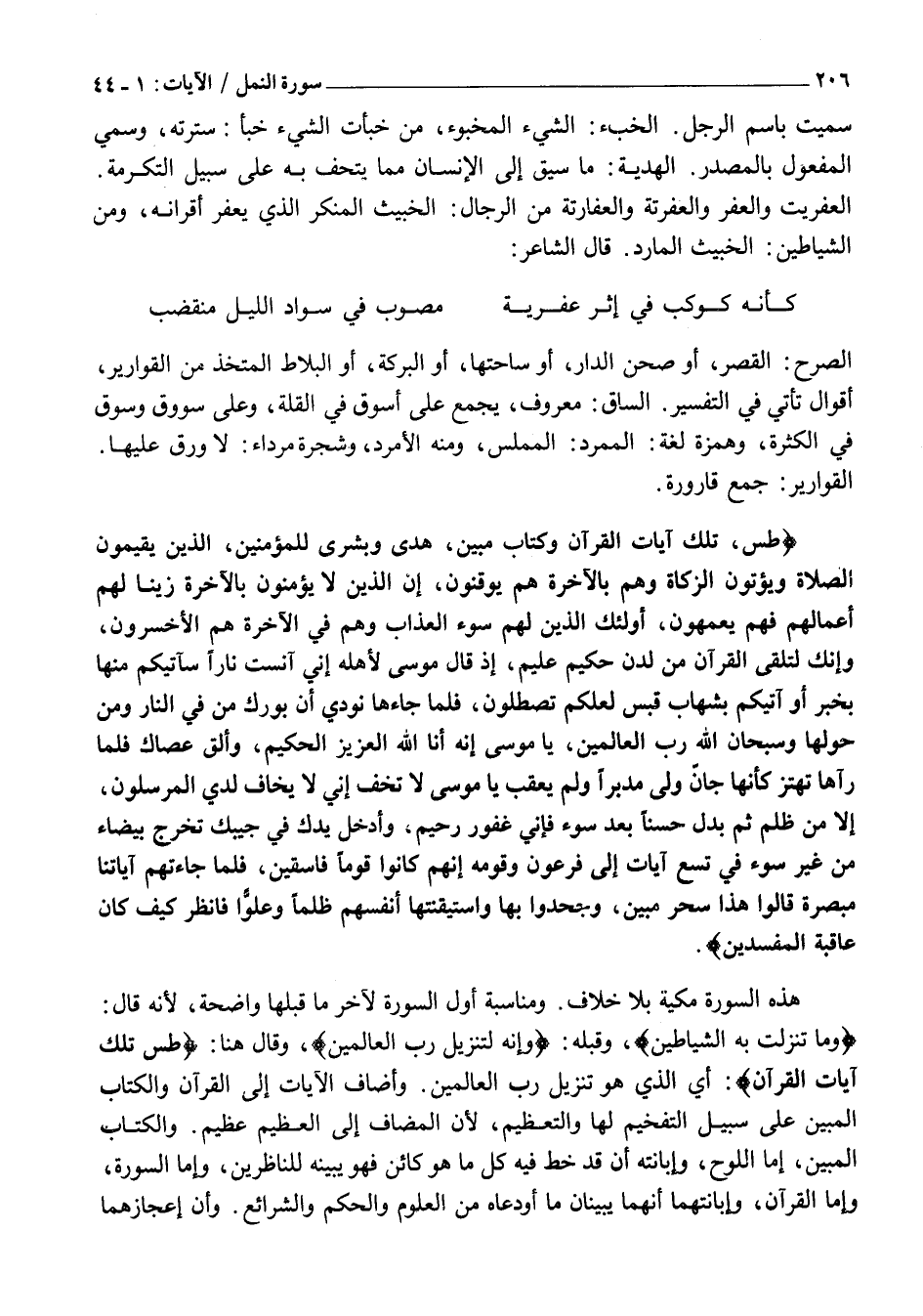 طس، تِلْكَ آياتُ الْقُرْآنِ وَكِتابٍ مُبِينٍ، هُدىً وَبُشْرى لِلْمُؤْمِنِينَ، الَّذِينَ يُقِيمُونَ الصَّلاةَ وَيُؤْتُونَ الزَّكاةَ وَهُمْ بِالْآخِرَةِ هُمْ يُوقِنُونَ، إِنَّ الَّذِينَ لَا يُؤْمِنُونَ بِالْآخِرَةِ زَيَّنَّا لَهُمْ أَعْمالَهُمْ فَهُمْ يَعْمَهُونَ، أُوْلئِكَ الَّذِينَ لَهُمْ سُوءُ الْعَذابِ وَهُمْ فِي الْآخِرَةِ هُمُ الْأَخْسَرُونَ، وَإِنَّكَ لَتُلَقَّى الْقُرْآنَ مِنْ لَدُنْ حَكِيمٍ عَلِيمٍ، إِذْ قالَ مُوسى لِأَهْلِهِ إِنِّي آنَسْتُ نَارًا سَآتِيكُمْ مِنْها بِخَبَرٍ أَوْ آتِيكُمْ بِشِهابٍ قَبَسٍ لَعَلَّكُمْ تَصْطَلُونَ، فَلَمَّا جاءَها نُودِيَ أَنْ بُورِكَ مَنْ فِي النَّارِ وَمَنْ حَوْلَها وَسُبْحانَ اللَّهِ رَبِّ الْعالَمِينَ، يا مُوسى إِنَّهُ أَنَا اللَّهُ الْعَزِيزُ الْحَكِيمُ، وَأَلْقِ عَصاكَ فَلَمَّا رَآها تَهْتَزُّ كَأَنَّها جَانٌّ وَلَّى مُدْبِراً وَلَمْ يُعَقِّبْ يَا مُوسى لَا تَخَفْ إِنِّي لَا يَخافُ لَدَيَّ الْمُرْسَلُونَ، إِلَّا مَنْ ظَلَمَ ثُمَّ بَدَّلَ حُسْناً بَعْدَ سُوءٍ فَإِنِّي غَفُورٌ رَحِيمٌ، وَأَدْخِلْ يَدَكَ فِي جَيْبِكَ تَخْرُجْ بَيْضاءَ مِنْ غَيْرِ سُوءٍ فِي تِسْعِ آياتٍ إِلى فِرْعَوْنَ وَقَوْمِهِ إِنَّهُمْ كانُوا قَوْماً فاسِقِينَ، فَلَمَّا جاءَتْهُمْ آياتُنا مُبْصِرَةً قالُوا هَذَا سِحْرٌ مُبِينٌ، وَجَحَدُوا بِها وَاسْتَيْقَنَتْها أَنْفُسُهُمْ ظُلْماً وَعُلُوًّا فَانْظُرْ كَيْفَ كانَ عاقِبَةُ الْمُفْسِدِينَ.