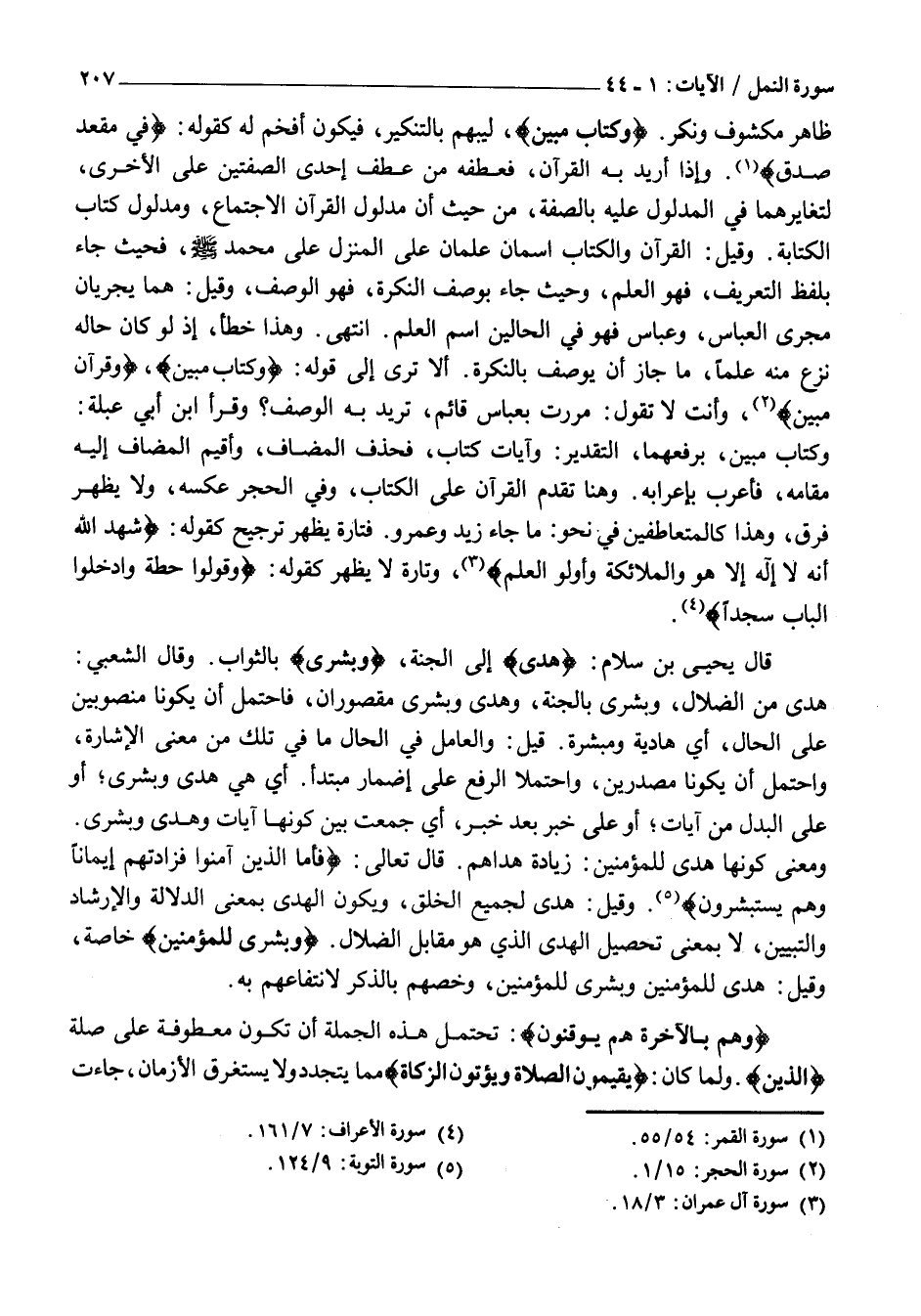 وكتاب مُبِينٌ، بِرَفْعِهِمَا، التَّقْدِيرُ: وَآيَاتُ كِتَابٍ، فَحُذِفَ الْمُضَافُ، وَأُقِيمَ الْمُضَافُ إِلَيْهِ مَقَامَهُ، فَأُعْرِبَ بِإِعْرَابِهِ. وَهُنَا تَقَدَّمَ الْقُرْآنُ عَلَى الْكِتَابِ، وَفِي الْحِجْرِ عَكْسُهُ، وَلَا يَظْهَرُ فَرْقٌ، وَهَذَا كَالْمُتَعَاطِفَيْنِ فِي نَحْوِ: مَا جَاءَ زَيْدٌ وَعَمْرٌو. فَتَارَةٌ يَظْهَرُ تَرْجِيحٌ كَقَوْلِهِ: شَهِدَ اللَّهُ أَنَّهُ لَا إِلهَ إِلَّا هُوَ وَالْمَلائِكَةُ وَأُولُوا الْعِلْمِ «3» ، وَتَارَةً لَا يَظْهَرُ كَقَوْلِهِ: وَقُولُوا حِطَّةٌ وَادْخُلُوا الْبابَ سُجَّداً «4» .