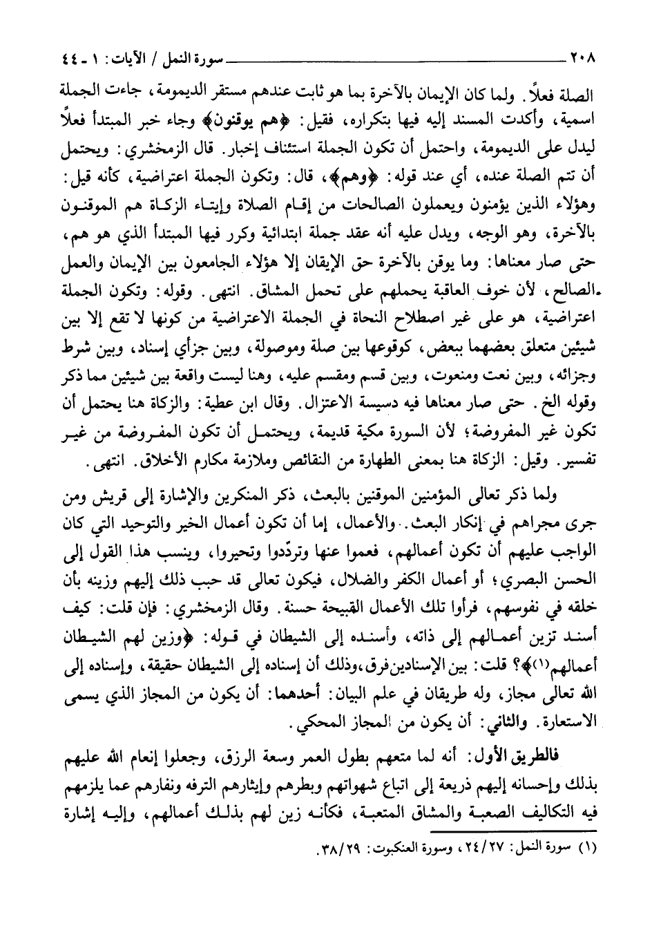 وَهَؤُلَاءِ الَّذِينَ يُؤْمِنُونَ وَيَعْمَلُونَ الصَّالِحَاتِ مِنْ إِقَامِ الصَّلَاةِ وَإِيتَاءِ الزَّكَاةِ هُمُ الْمُوقِنُونَ بِالْآخِرَةِ، وَهُوَ الْوَجْهُ، وَيَدُلُّ عَلَيْهِ أَنَّهُ عَقَدَ جُمْلَةً ابْتِدَائِيَّةً وَكَرَّرَ فِيهَا الْمُبْتَدَأُ الَّذِي هُوَ هُمْ، حَتَّى صَارَ مَعْنَاهَا: وَمَا يُوقِنُ بِالْآخِرَةِ حَقَّ الْإِيقَانِ إِلَّا هَؤُلَاءِ الْجَامِعُونَ بَيْنَ الْإِيمَانِ وَالْعَمَلِ الصَّالِحِ، لِأَنَّ خَوْفَ الْعَاقِبَةِ يَحْمِلُهُمْ عَلَى تَحَمُّلِ الْمَشَاقِّ. انْتَهَى. وَقَوْلُهُ: وَتَكُونُ الْجُمْلَةُ اعْتِرَاضِيَّةً، هُوَ عَلَى غَيْرِ اصْطِلَاحِ النُّحَاةِ فِي الْجُمْلَةِ الِاعْتِرَاضِيَّةِ مِنْ كَوْنِهَا لَا تَقَعُ إِلَّا بَيْنَ شَيْئَيْنِ مُتَعَلِّقٌ بَعْضُهُمَا بِبَعْضٍ، كَوُقُوعِهَا بَيْنَ صِلَةِ وموصولة، وَبَيْنَ جُزْأَيْ إِسْنَادٍ، وَبَيْنَ شَرْطٍ وَجَزَائِهِ، وَبَيْنَ نَعْتٍ وَمَنْعُوتٍ، وَبَيْنَ قَسَمٍ وَمُقْسَمٍ عَلَيْهِ، وَهُنَا لَيْسَتْ وَاقِعَةً بَيْنَ شَيْئَيْنِ مِمَّا ذُكِرَ وَقَوْلُهُ إِلْخَ. حَتَّى صَارَ مَعْنَاهَا فِيهِ دَسِيسَةُ الِاعْتِزَالِ. وَقَالَ ابْنُ عَطِيَّةَ: وَالزَّكَاةُ هُنَا يُحْتَمَلُ أَنْ تَكُونَ غَيْرَ الْمَفْرُوضَةِ لِأَنَّ السُّورَةَ مَكِّيَّةٌ قَدِيمَةٌ، وَيُحْتَمَلُ أَنْ تَكُونَ الْمَفْرُوضَةَ مِنْ غَيْرِ تَفْسِيرٍ. وَقِيلَ: الزَّكَاةُ هُنَا بِمَعْنَى الطَّهَارَةِ مِنَ النَّقَائِصِ وَمُلَازِمَةِ مَكَارِمِ الْأَخْلَاقِ. انْتَهَى.