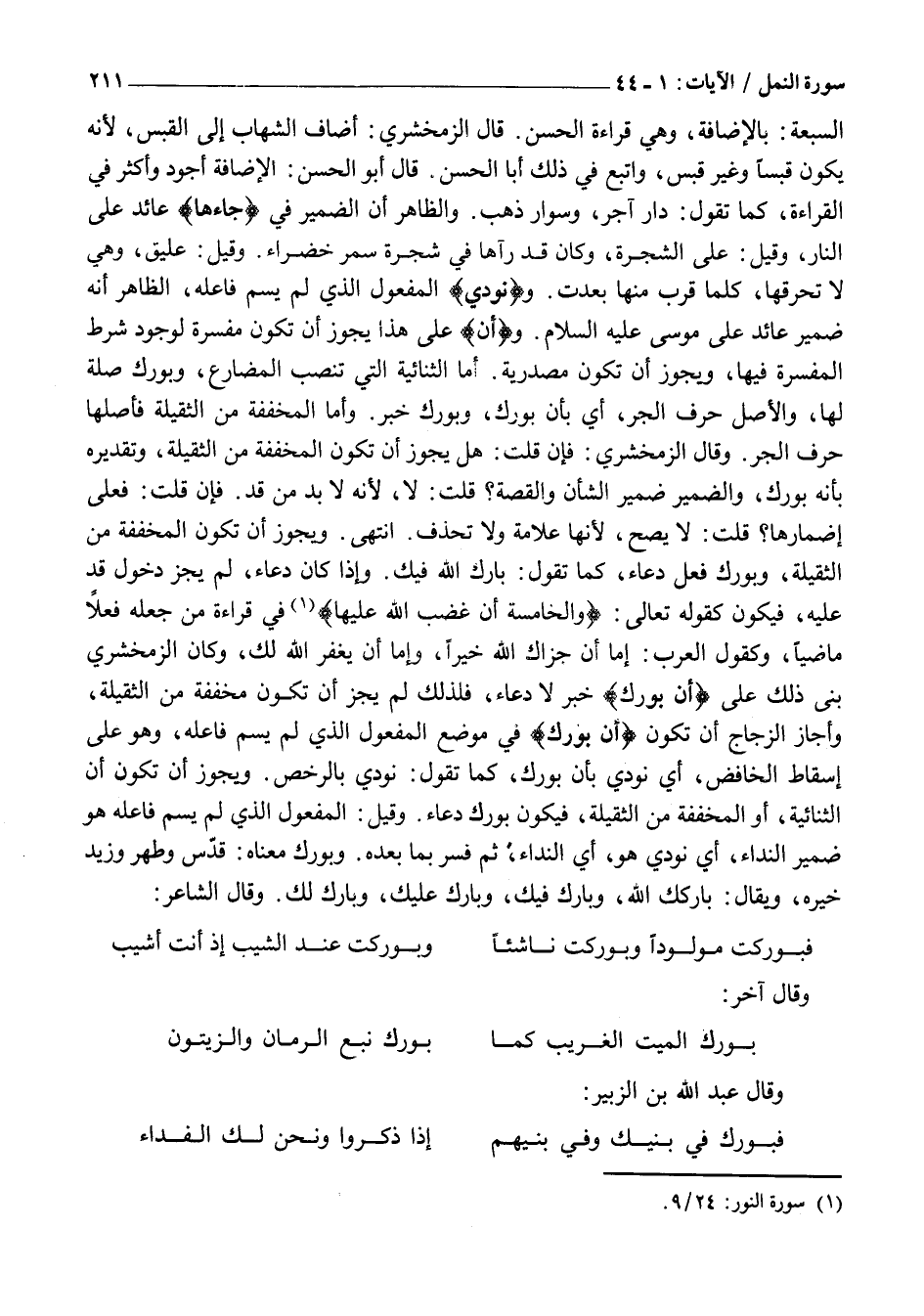 السَّبْعَةِ: بِالْإِضَافَةِ، وَهِيَ قِرَاءَةُ الْحَسَنِ. قَالَ الزَّمَخْشَرِيُّ: أَضَافَ الشِّهَابَ إِلَى الْقَبَسِ، لِأَنَّهُ يَكُونُ قَبَسًا وَغَيْرَ قَبَسٍ، وَاتَّبَعَ فِي ذَلِكَ أَبَا الْحَسَنِ. قَالَ أَبُو الْحَسَنِ: الْإِضَافَةُ أَجْوَدُ وَأَكْثَرُ فِي الْقِرَاءَةِ، كَمَا تَقُولُ: دَارُ آجُرٍّ، وَسَوَارُ ذَهَبٍ. وَالظَّاهِرُ أَنَّ الضَّمِيرَ فِي جاءَها عَائِدٌ عَلَى النَّارِ، وَقِيلَ: عَلَى الشَّجَرَةِ، وَكَانَ قَدْ رَآهَا فِي شَجَرَةِ سَمُرٍ خضراء. وَقِيلَ: عَلِيقٍ، وَهِيَ لَا تُحْرِقُهَا، كُلَّمَا قَرُبَ مِنْهَا بعدت. ونُودِيَ المفعول الذي لم يسم فَاعِلُهُ، الظَّاهِرُ أَنَّهُ ضَمِيرٌ عَائِدٌ عَلَى مُوسَى عَلَيْهِ السلام. وأَنْ عَلَى هَذَا يَجُوزُ أَنْ تَكُونَ مُفَسِّرَةً لِوُجُودِ شَرْطِ الْمُفَسِّرَةِ فِيهَا، وَيَجُوزُ أَنْ تَكُونَ مَصْدَرِيَّةً. أَمَّا الثُّنَائِيَّةَ الَّتِي تَنْصِبُ الْمُضَارِعَ، وَبُورِكَ صِلَةٌ لَهَا، وَالْأَصْلُ حَرْفِ الْجَرِّ، أَيْ بِأَنَّ بُورِكَ، وَبُورِكَ خَبَرٌ. وَأَمَّا الْمُخَفَّفَةُ مِنَ الثَّقِيلَةِ فَأَصْلُهَا حَرْفُ الْجَرِّ. وَقَالَ الزَّمَخْشَرِيُّ: فَإِنْ قُلْتَ: هَلْ يَجُوزُ أَنْ تَكُونَ الْمُخَفَّفَةَ مِنَ الثَّقِيلَةِ، وَتَقْدِيرُهُ بِأَنَّهُ بُورِكَ، وَالضَّمِيرُ ضَمِيرُ الشَّأْنِ وَالْقِصَّةِ؟ قُلْتُ: لَا، لِأَنَّهُ لَا بُدَّ مِنْ قَدْ. فَإِنْ قُلْتَ: فَعَلَى إِضْمَارِهَا؟ قُلْتُ: لَا يَصِحُّ، لِأَنَّهَا عَلَامَةٌ وَلَا تُحْذَفُ. انْتَهَى. وَيَجُوزُ أَنْ تَكُونَ الْمُخَفَّفَةَ مِنَ الثَّقِيلَةِ، وَبُورِكَ فِعْلُ دُعَاءٍ، كَمَا تَقُولُ: بَارَكَ اللَّهُ فِيكَ. وَإِذَا كَانَ دُعَاءً، لَمْ يَجُزْ دُخُولُ قَدْ عَلَيْهِ، فَيَكُونُ كَقَوْلِهِ تَعَالَى: وَالْخامِسَةَ أَنَّ غَضَبَ اللَّهِ عَلَيْها «1» فِي قِرَاءَةِ مَنْ جَعَلَهُ فِعْلًا مَاضِيًا، وَكَقَوْلِ الْعَرَبِ: إِمَّا أَنْ جَزَاكَ اللَّهُ خَيْرًا، وَإِمَّا أَنْ يَغْفِرَ اللَّهُ لَكَ، وَكَانَ الزَّمَخْشَرِيُّ بَنَى ذَلِكَ عَلَى أَنْ بُورِكَ خَبَرٌ لَا دُعَاءٌ، فَلِذَلِكَ لَمْ يَجُزْ أَنْ تَكُونَ مُخَفَّفَةً مِنَ الثَّقِيلَةِ، وَأَجَازَ الزَّجَّاجُ أَنْ تَكُونَ أَنْ بُورِكَ فِي مَوْضِعِ الْمَفْعُولِ الَّذِي لَمْ يُسَمَّ فَاعِلُهُ، وَهُوَ عَلَى إِسْقَاطِ الْخَافِضِ، أَيْ نودي بأن بُورِكَ، كَمَا تَقُولُ: نُودِيَ بِالرُّخَصِ. وَيَجُوزُ أَنْ تَكُونَ أَنِ الثُّنَائِيَّةَ، أَوِ الْمُخَفَّفَةَ مِنَ الثَّقِيلَةِ، فَيَكُونُ بُورِكَ دُعَاءً. وَقِيلَ: الْمَفْعُولُ الَّذِي لَمْ يُسَمَّ فَاعِلُهُ هُوَ ضَمِيرُ النِّدَاءِ، أَيْ نُودِيَ هُوَ، أَيِ النِّدَاءَ، ثُمَّ فُسِّرَ بِمَا بَعْدَهُ. وَبُورِكَ مَعْنَاهُ: قُدِّسَ وَطُهِّرَ وَزِيدَ خَيْرُهُ، وَيُقَالُ: بَارَكَكَ اللَّهُ، وَبَارَكَ فِيكَ، وَبَارَكَ عَلَيْكَ، وَبَارَكَ لَكَ. وَقَالَ الشَّاعِرُ: