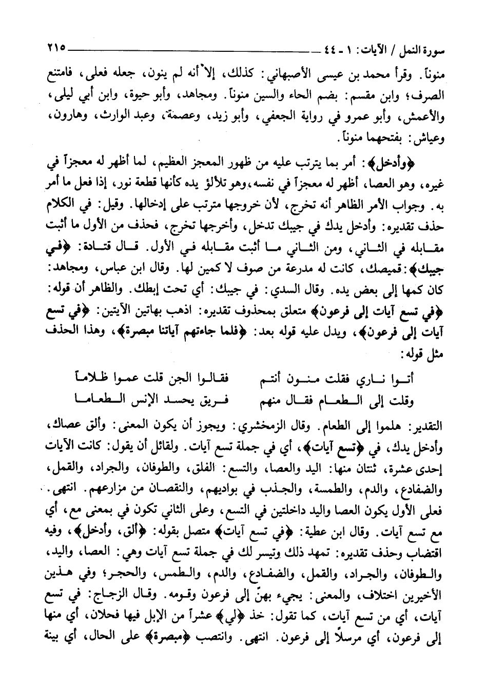 فَعَلَى الْأَوَّلِ يَكُونُ الْعَصَا وَالْيَدُ دَاخِلَتَيْنِ فِي التِّسْعِ، وَعَلَى الثَّانِي تَكُونَ فِي بِمَعْنَى مَعَ، أَيْ مَعَ تِسْعِ آيَاتٍ. وَقَالَ ابْنُ عَطِيَّةَ: فِي تِسْعِ آياتٍ مُتَّصِلٌ بِقَوْلِهِ: أَلْقِ، وأَدْخِلْ، وَفِيهِ اقْتِضَابٌ وَحَذْفٌ تَقْدِيرُهُ: تُمَهَّدْ ذَلِكَ وَتُيَسَّرْ لَكَ فِي جُمْلَةِ تِسْعِ آيَاتٍ وَهِيَ: الْعَصَا، وَالْيَدُ، وَالطُّوفَانُ، وَالْجَرَادُ، وَالْقُمَّلُ، وَالضَّفَادِعُ، وَالدَّمُ، وَالطَّمْسُ، وَالْحَجَرُ وَفِي هَذَيْنِ الْأَخِيرَيْنِ اخْتِلَافٌ، وَالْمَعْنَى: يَجِيءُ بِهِنَّ إِلَى فِرْعَوْنُ وَقَوْمُهُ. وَقَالَ الزَّجَّاجُ: فِي تِسْعِ آيَاتٍ، أَيْ مِنْ تِسْعِ آيَاتٍ، كَمَا تَقُولُ: خُذْ لِي عَشْرًا مِنَ الْإِبِلِ فِيهَا فَحْلَانِ، أَيْ مِنْهَا إِلَى فِرْعَوْنَ، أَيْ مُرْسَلًا إِلَى فِرْعَوْنَ. انْتَهَى. وَانْتُصِبَ مُبْصِرَةً عَلَى الْحَالِ، أَيْ بَيِّنَةٍ