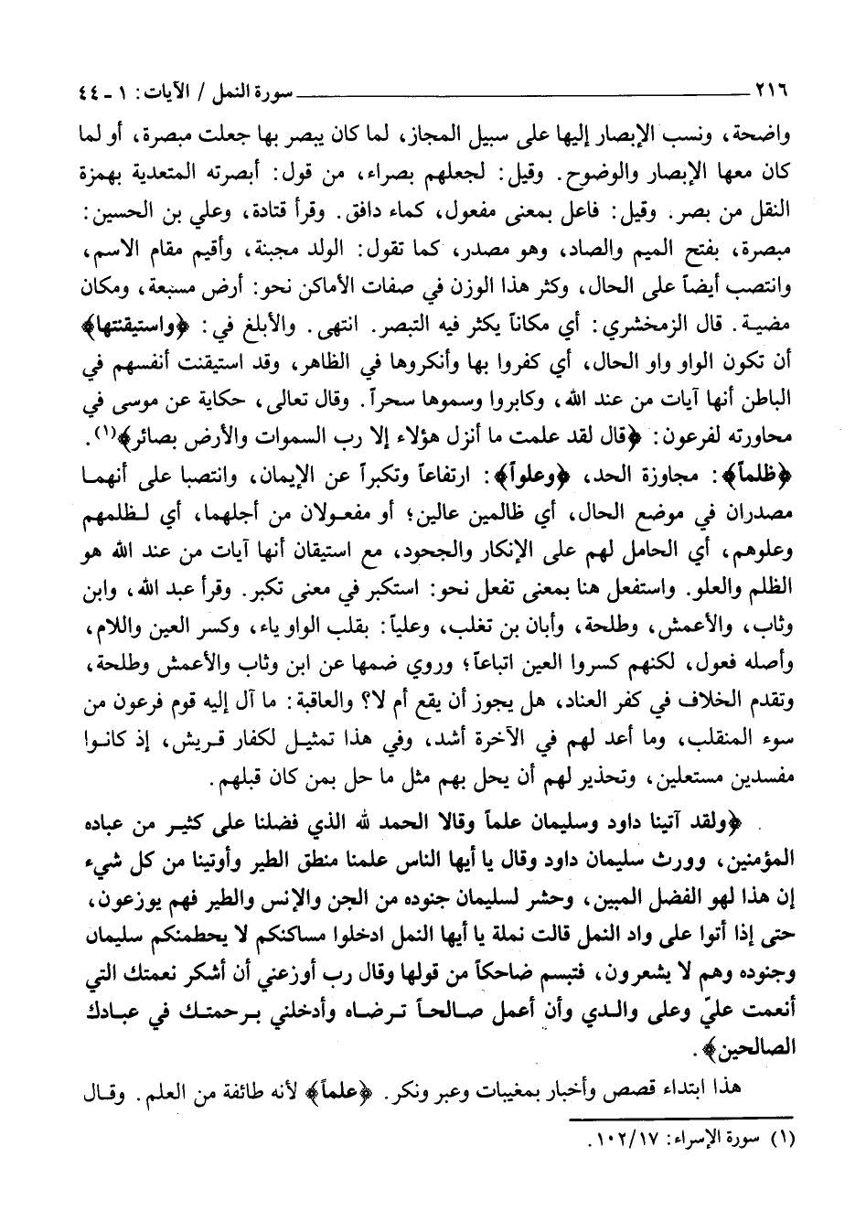 وَلَقَدْ آتَيْنا داوُدَ وَسُلَيْمانَ عِلْماً وَقالا الْحَمْدُ لِلَّهِ الَّذِي فَضَّلَنا عَلى كَثِيرٍ مِنْ عِبادِهِ الْمُؤْمِنِينَ، وَوَرِثَ سُلَيْمانُ داوُدَ وَقالَ يا أَيُّهَا النَّاسُ عُلِّمْنا مَنْطِقَ الطَّيْرِ وَأُوتِينا مِنْ كُلِّ شَيْءٍ إِنَّ هَذَا لَهُوَ الْفَضْلُ الْمُبِينُ، وَحُشِرَ لِسُلَيْمانَ جُنُودُهُ مِنَ الْجِنِّ وَالْإِنْسِ وَالطَّيْرِ فَهُمْ يُوزَعُونَ، حَتَّى إِذا أَتَوْا عَلى وادِ النَّمْلِ قالَتْ نَمْلَةٌ يَا أَيُّهَا النَّمْلُ ادْخُلُوا مَساكِنَكُمْ لَا يَحْطِمَنَّكُمْ سُلَيْمانُ وَجُنُودُهُ وَهُمْ لَا يَشْعُرُونَ، فَتَبَسَّمَ ضاحِكاً مِنْ قَوْلِها وَقالَ رَبِّ أَوْزِعْنِي أَنْ أَشْكُرَ نِعْمَتَكَ الَّتِي أَنْعَمْتَ عَلَيَّ وَعَلى والِدَيَّ وَأَنْ أَعْمَلَ صالِحاً تَرْضاهُ وَأَدْخِلْنِي بِرَحْمَتِكَ فِي عِبادِكَ الصَّالِحِينَ.
