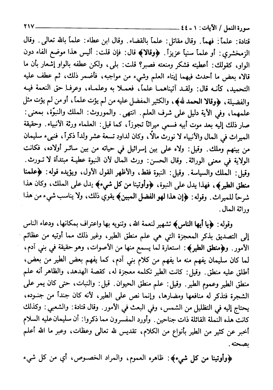 وَقَوْلُهُ: يَا أَيُّهَا النَّاسُ تَشْهِيرٌ لِنِعْمَةِ اللَّهِ، وَتَنْوِيهٌ بِهَا وَاعْتِرَافٌ بِمَكَانِهَا، وَدُعَاءُ النَّاسِ إِلَى التَّصْدِيقِ بِذِكْرِ الْمُعْجِزَةِ الَّتِي هِيَ عِلْمُ مَنْطِقِ الطَّيْرِ، وَغَيْرِ ذَلِكَ مِمَّا أُوتِيَهُ من عظائم الأمور. ومَنْطِقَ الطَّيْرِ: اسْتِعَارَةٌ لِمَا يُسْمَعُ مِنْهَا مِنَ الْأَصْوَاتِ، وَهُوَ حَقِيقَةٌ فِي بَنِي آدَمَ، لَمَّا كَانَ سُلَيْمَانُ يُفْهَمُ مِنْهُ مَا يُفْهَمُ مِنْ كَلَامِ بَنِي آدَمَ، كَمَا يَفْهَمُ بَعْضُ الطَّيْرِ مِنْ بَعْضٍ، أَطْلَقَ عَلَيْهِ مَنْطِقَ. وَقِيلَ: كَانَتِ الطَّيْرُ تُكَلِّمُهُ مُعْجِزَةً لَهُ، كَقِصَّةِ الْهُدْهُدِ، وَالظَّاهِرُ أَنَّهُ عُلِّمَ مَنْطِقَ الطَّيْرِ وَعُمُومِ الطَّيْرِ. وَقِيلَ: عُلِّمَ مَنْطِقَ الْحَيَوَانِ. قِيلَ: وَالنَّبَاتِ، حَتَّى كَانَ يَمُرُّ عَلَى الشَّجَرَةِ فَتَذْكُرُ لَهُ مَنَافِعَهَا وَمَضَارَّهَا، وَإِنَّمَا نَصَّ عَلَى الطَّيْرِ، لِأَنَّهُ كَانَ جُنْدًا مِنْ جُنُودِهِ، يَحْتَاجُ إِلَيْهِ فِي التَّظْلِيلِ مِنَ الشَّمْسِ، وَفِي الْبَعْثِ فِي الْأُمُورِ. وَقَالَ قَتَادَةُ: وَالشَّعْبِيُّ: وَكَذَلِكَ كَانَتْ هَذِهِ النَّمْلَةُ الْقَائِلَةُ ذَاتَ جَنَاحَيْنِ. وَأَوْرَدَ المفسرون مما ذكروا: أَنَّ سُلَيْمَانَ عَلَيْهِ السَّلَامُ أَخْبَرَ عَنْ كَثِيرٍ مِنَ الطَّيْرِ بِأَنْوَاعٍ مِنَ الْكَلَامِ، تَقْدِيسٌ لِلَّهِ تَعَالَى وَعِظَاتٌ، وَعِبَرٌ مَا اللَّهُ أَعْلَمُ بِصِحَّتِهِ.