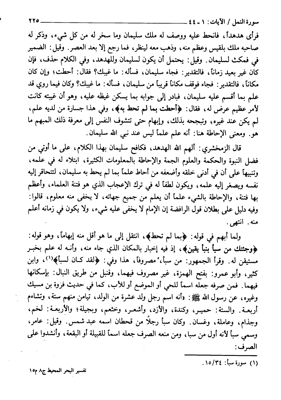 وَقِيلَ: الضَّمِيرُ فِي فَمَكَثَ لِسُلَيْمَانَ. وَقِيلَ: يُحْتَمَلُ أَنْ يَكُونَ لِسُلَيْمَانَ وَلِلْهُدْهُدِ، وَفِي الْكَلَامِ حَذْفٌ، فَإِنْ كَانَ غَيْرَ بَعِيدٍ زَمَانًا، فَالتَّقْدِيرُ: فَجَاءَ سُلَيْمَانُ، فَسَأَلَهُ: مَا غَيَّبَكَ؟ فَقَالَ: أَحَطْتُ وَإِنْ كَانَ مَكَانًا، فَالتَّقْدِيرُ: فَجَاءَ فَوَقَفَ مَكَانًا قَرِيبًا مِنْ سُلَيْمَانَ، فَسَأَلَهُ: مَا غَيَّبَكَ؟ وَكَانَ فِيمَا رُوِيَ قَدْ عَلِمَ بِمَا أَقْسَمَ عَلَيْهِ سُلَيْمَانُ، فَبَادَرَ إِلَى جَوَابِهِ بِمَا يُسَكِّنُ غَيْظَهُ عَلَيْهِ، وَهُوَ أَنَّ غَيْبَتَهُ كَانَتْ لِأَمْرٍ عَظِيمٍ عَرَضَ لَهُ، فَقَالَ: أَحَطْتُ بِما لَمْ تُحِطْ بِهِ، وَفِي هَذَا جَسَارَةُ مَنْ لَدَيْهِ عِلْمٌ، لَمْ يَكُنْ عِنْدَ غيره، وتبجحه بذلك، وإبهام حَتَّى تَتَشَوَّفَ النَّفْسُ إِلَى مَعْرِفَةِ ذَلِكَ الْمُبْهَمِ مَا هُوَ. وَمَعْنَى الْإِحَاطَةِ هُنَا: أَنَّهُ عَلِمَ عِلْمًا لَيْسَ عِنْدَ نَبِيِّ اللَّهِ سُلَيْمَانَ.