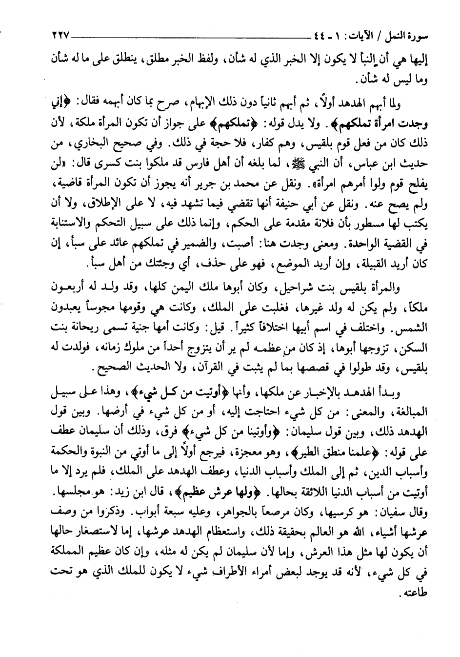 وَنُقِلَ عَنْ مُحَمَّدُ بْنُ جَرِيرٍ أَنَّهُ يَجُوزُ أَنْ تَكُونَ الْمَرْأَةُ قَاضِيَةً، وَلَمْ يَصِحَّ عَنْهُ. وَنُقِلَ عَنْ أَبِي حَنِيفَةَ أَنَّهَا تَقْضِي فِيمَا تَشْهَدُ فِيهِ، لَا عَلَى الْإِطْلَاقِ، وَلَا أَنْ يُكْتَبَ لَهَا مَسْطُورٌ بِأَنَّ فُلَانَةً مُقَدَّمَةٌ عَلَى الْحُكْمِ، وَإِنَّمَا ذَلِكَ عَلَى سَبِيلِ التَّحَكُّمِ وَالِاسْتِنَابَةِ فِي الْقَضِيَّةِ الْوَاحِدَةِ. وَمَعْنَى وَجَدْتُ هُنَا: أَصَبْتُ، وَالضَّمِيرُ فِي تَمْلِكُهُمْ عَائِدٌ عَلَى سَبَأٍ، إِنْ كَانَ أُرِيدَ الْقَبِيلَةُ، وَإِنْ أُرِيدَ الْمَوْضِعُ، فَهُوَ عَلَى حَذْفٍ، أَيْ وَجِئْتُكَ مِنْ أَهْلِ سَبَأٍ.