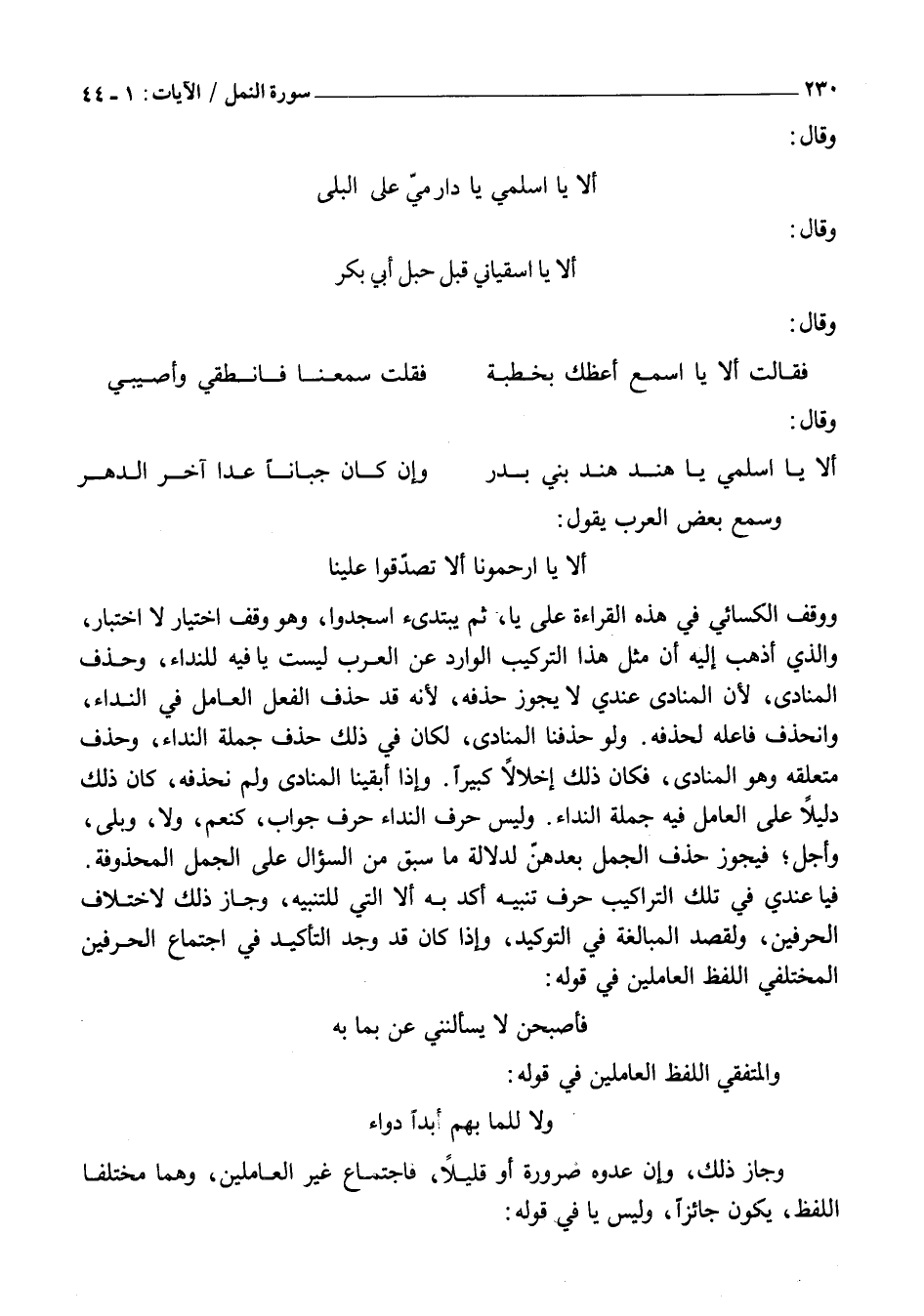 أَلَا يَا ارْحَمُونَا أَلَا تَصَدَّقُوا عَلَيْنَا وَوَقَفَ الْكِسَائِيُّ فِي هَذِهِ الْقِرَاءَةِ عَلَى يا، ثم يبتدىء اسْجُدُوا، وَهُوَ وَقْفُ اخْتِيَارٍ لَا اخْتِبَارٍ، وَالَّذِي أَذْهَبُ إِلَيْهِ أَنَّ مِثْلَ هَذَا التَّرْكِيبِ الْوَارِدِ عَنِ الْعَرَبِ لَيْسَتْ يَا فِيهِ لِلنِّدَاءِ، وَحُذِفَ الْمُنَادَى، لِأَنَّ الْمُنَادَى عِنْدِي لَا يَجُوزُ حَذْفُهُ، لأنه قد حذف الفعل الْعَامِلُ فِي النِّدَاءِ، وَانْحَذَفَ فَاعِلُهُ لِحَذْفِهِ. وَلَوْ حَذَفْنَا الْمُنَادَى، لَكَانَ فِي ذَلِكَ حَذْفَ جُمْلَةِ النِّدَاءِ، وَحَذْفَ مُتَعَلِّقِهِ وَهُوَ الْمُنَادَى، فَكَانَ ذَلِكَ إِخْلَالًا كَبِيرًا. وَإِذَا أَبْقَيْنَا الْمُنَادَى وَلَمْ نَحْذِفْهُ، كَانَ ذَلِكَ دَلِيلًا عَلَى الْعَامِلِ فِيهِ جُمْلَةُ النِّدَاءِ. وَلَيْسَ حَرْفُ النِّدَاءِ حَرْفَ جَوَابٍ، كَنَعَمْ، وَلَا، وَبَلَى، وَأَجَلْ فَيَجُوزُ حَذْفُ الْجُمَلِ بَعْدَهُنَّ لِدَلَالَةِ مَا سَبَقَ مِنَ السُّؤَالِ عَلَى الْجُمَلِ المحذوفة.
