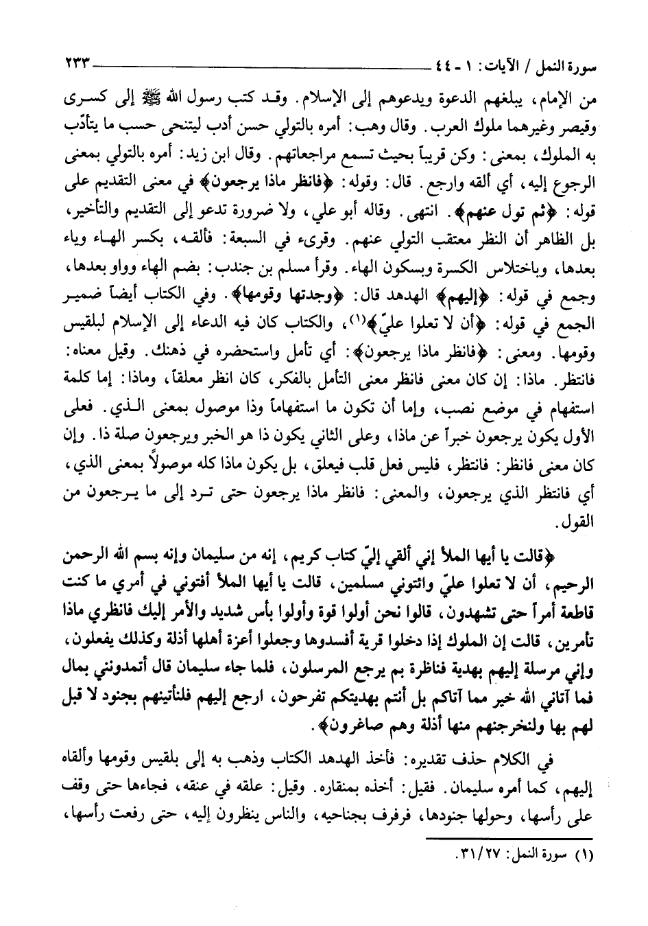 قالَتْ يَا أَيُّهَا الْمَلَأُ إِنِّي أُلْقِيَ إِلَيَّ كِتابٌ كَرِيمٌ، إِنَّهُ مِنْ سُلَيْمانَ وَإِنَّهُ بِسْمِ اللَّهِ الرَّحْمنِ الرَّحِيمِ، أَلَّا تَعْلُوا عَلَيَّ وَأْتُونِي مُسْلِمِينَ، قالَتْ يَا أَيُّهَا الْمَلَأُ أَفْتُونِي فِي أَمْرِي مَا كُنْتُ قاطِعَةً أَمْراً حَتَّى تَشْهَدُونِ، قالُوا نَحْنُ أُولُوا قُوَّةٍ وَأُولُوا بَأْسٍ شَدِيدٍ وَالْأَمْرُ إِلَيْكِ فَانْظُرِي مَاذَا تَأْمُرِينَ، قالَتْ إِنَّ الْمُلُوكَ إِذا دَخَلُوا قَرْيَةً أَفْسَدُوها وَجَعَلُوا أَعِزَّةَ أَهْلِها أَذِلَّةً وَكَذلِكَ يَفْعَلُونَ، وَإِنِّي مُرْسِلَةٌ إِلَيْهِمْ بِهَدِيَّةٍ فَناظِرَةٌ بِمَ يَرْجِعُ الْمُرْسَلُونَ، فَلَمَّا جاءَ سُلَيْمانَ قالَ أَتُمِدُّونَنِ بِمالٍ فَما آتانِيَ اللَّهُ خَيْرٌ مِمَّا آتاكُمْ بَلْ أَنْتُمْ بِهَدِيَّتِكُمْ تَفْرَحُونَ، ارْجِعْ إِلَيْهِمْ فَلَنَأْتِيَنَّهُمْ بِجُنُودٍ لَا قِبَلَ لَهُمْ بِها وَلَنُخْرِجَنَّهُمْ مِنْها أَذِلَّةً وَهُمْ صاغِرُونَ.