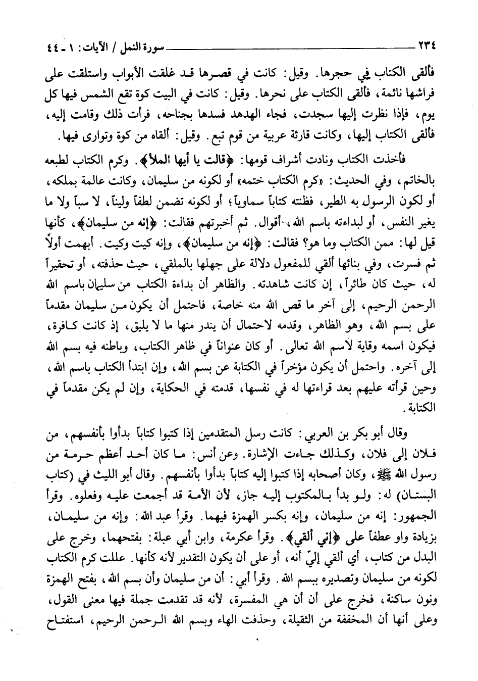 وَقَالَ أَبُو بَكْرِ بْنُ الْعَرَبِيِّ: كَانَتْ رُسُلُ الْمُتَقَدِّمِينَ إذا كتبوا كتابا بدأوا بِأَنْفُسِهِمْ، مِنْ فُلَانٍ إِلَى فُلَانٍ، وَكَذَلِكَ جَاءَتِ الْإِشَارَةُ. وَعَنْ أَنَسٍ: مَا كَانَ أَحَدٌ أَعْظَمَ حُرْمَةً مِنْ رَسُولِ اللَّهِ صَلَّى اللَّهُ عَلَيْهِ وَسَلَّمَ، وَكَانَ أَصْحَابُهُ إِذَا كَتَبُوا إِلَيْهِ كِتَابًا بدأوا بِأَنْفُسِهِمْ. وَقَالَ أَبُو اللَّيْثِ فِي (كِتَابِ الْبُسْتَانِ) لَهُ: وَلَوْ بَدَأَ بِالْمَكْتُوبِ إِلَيْهِ جَازَ، لِأَنَّ الْأُمَّةَ قَدْ أَجْمَعَتْ عَلَيْهِ وَفَعَلُوهُ. وَقَرَأَ الْجُمْهُورُ: إِنَّهُ مِنْ سُلَيْمَانَ، وَإِنَّهُ بِكَسْرِ الْهَمْزَةِ فِيهِمَا. وَقَرَأَ عَبْدُ اللَّهِ: وَإِنَّهُ مِنْ سُلَيْمَانَ، بِزِيَادَةِ وَاوٍ عَطْفًا عَلَى إِنِّي أُلْقِيَ. وَقَرَأَ عِكْرِمَةُ، وَابْنُ أَبِي عَبْلَةَ: بِفَتْحِهِمَا، وَخَرَجَ عَلَى الْبَدَلِ مِنْ كِتَابٍ، أَيْ أُلْقِيَ إِلَيَّ أَنَّهُ، أَوْ عَلَى أَنْ يَكُونَ التَّقْدِيرُ لِأَنَّهُ كَأَنَّهَا. عَلَّلَتْ كَرَمَ الْكِتَابِ لِكَوْنِهِ مِنْ سُلَيْمَانَ وَتَصْدِيرِهِ بِبِسْمِ اللَّهِ. وَقَرَأَ أُبَيٌّ: أَنْ مِنْ سُلَيْمَانَ وَأَنْ بِسْمِ اللَّهِ، بِفَتْحِ الْهَمْزَةِ وَنُونٍ سَاكِنَةٍ، فَخَرَّجَ عَلَى أَنَّ أَنْ هِيَ الْمُفَسِّرَةُ، لِأَنَّهُ قَدْ تَقَدَّمَتْ جملة فيها معنى القول، وَعَلَى أَنَّهَا أَنْ الْمُخَفَّفَةُ مِنَ الثَّقِيلَةِ، وَحُذِفَتِ الْهَاءُ وَبِسْمِ اللَّهِ الرَّحْمَنِ الرَّحِيمِ، اسْتِفْتَاحٌ