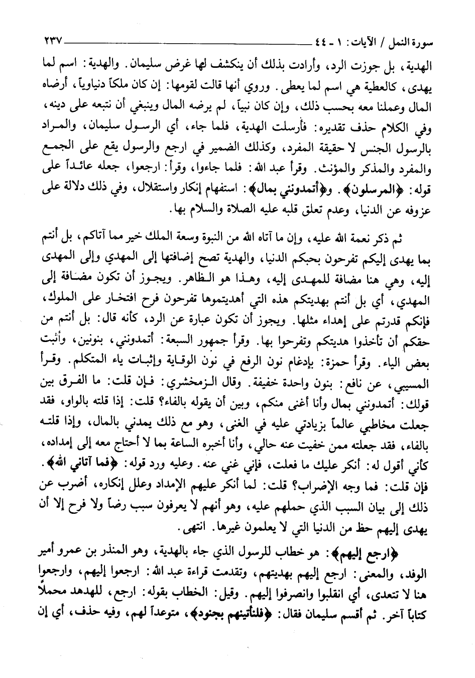 الْهَدِيَّةِ، بَلْ جَوَّزَتِ الرَّدَّ، وَأَرَادَتْ بِذَلِكَ أَنْ يَنْكَشِفَ لَهَا غَرَضُ سُلَيْمَانَ. وَالْهَدِيَّةُ: اسْمٌ لِمَا يُهْدَى، كَالْعَطِيَّةِ هِيَ اسْمٌ لِمَا يُعْطَى. وَرُوِيَ أَنَّهَا قَالَتْ لِقَوْمِهَا: إِنْ كَانَ مَلِكًا دُنْيَاوِيًّا، أَرْضَاهُ الْمَالُ وَعَمِلْنَا مَعَهُ بِحَسَبِ ذَلِكَ، وَإِنْ كَانَ نَبِيًّا، لَمْ يُرْضِهِ الْمَالُ وَيَنْبَغِي أَنْ نَتَّبِعَهُ عَلَى دِينِهِ، وَفِي الْكَلَامِ حَذْفٌ تَقْدِيرُهُ: فَأَرْسَلَتِ الْهَدِيَّةَ، فَلَمَّا جَاءَ، أَيِ الرَّسُولُ سُلَيْمَانَ، وَالْمُرَادُ بِالرَّسُولِ الْجِنْسُ لَا حَقِيقَةَ الْمُفْرَدِ، وَكَذَلِكَ الضَّمِيرُ في ارجع والرسول يَقَعُ عَلَى الْجَمْعِ وَالْمُفْرَدِ وَالْمُذَكَّرِ وَالْمُؤَنَّثِ. وَقَرَأَ عَبْدُ الله: فلما جاءوا، وقرأ: ارْجِعُوا، جَعَلَهُ عَائِدًا عَلَى قوله: الْمُرْسَلُونَ. وأَ تُمِدُّونَنِ بِمالٍ: اسْتِفْهَامُ إِنْكَارٍ وَاسْتِقْلَالٍ، وَفِي ذَلِكَ دَلَالَةٌ عَلَى عُزُوفِهِ عَنِ الدُّنْيَا، وَعَدَمِ تَعَلُّقِ قَلْبِهِ عَلَيْهِ الصَّلَاةُ وَالسَّلَامُ بِهَا.