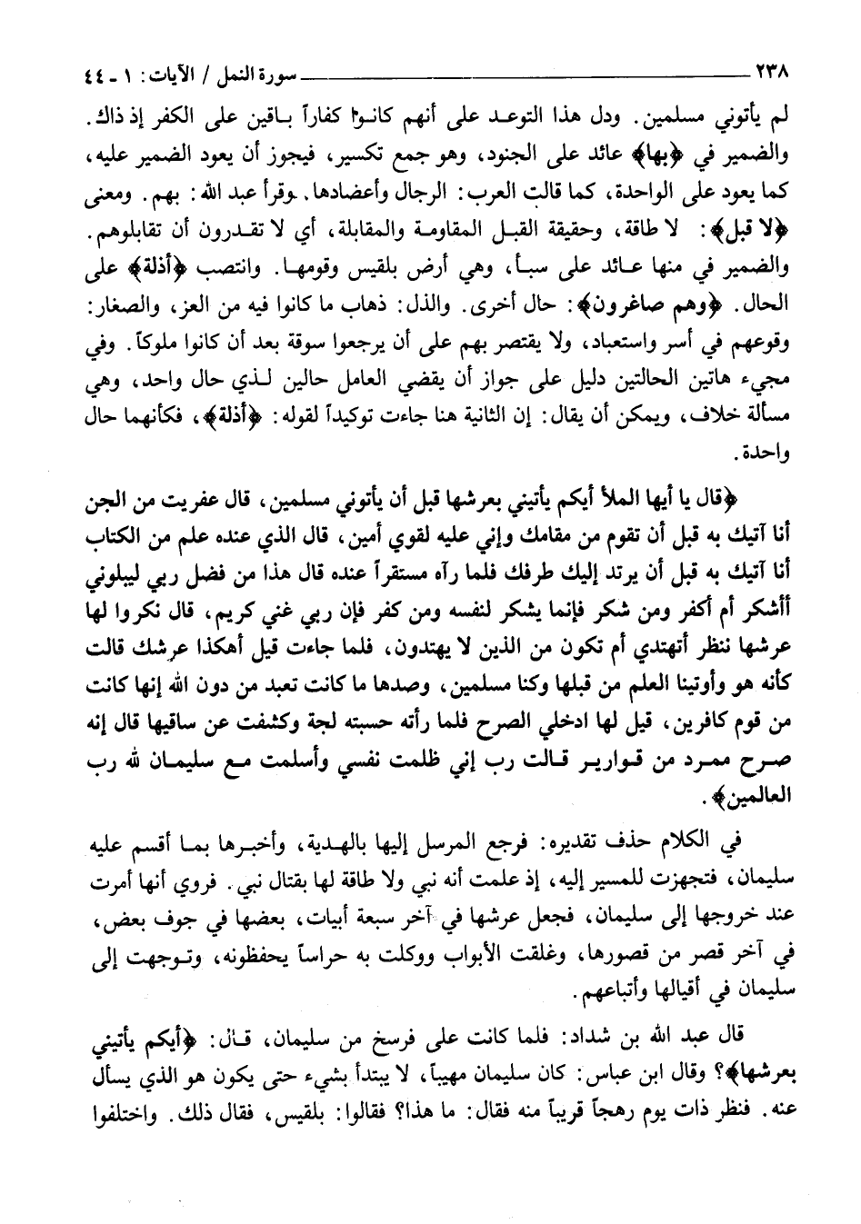 قالَ يا أَيُّهَا الْمَلَؤُا أَيُّكُمْ يَأْتِينِي بِعَرْشِها قَبْلَ أَنْ يَأْتُونِي مُسْلِمِينَ، قالَ عِفْرِيتٌ مِنَ الْجِنِّ أَنَا آتِيكَ بِهِ قَبْلَ أَنْ تَقُومَ مِنْ مَقامِكَ وَإِنِّي عَلَيْهِ لَقَوِيٌّ أَمِينٌ، قالَ الَّذِي عِنْدَهُ عِلْمٌ مِنَ الْكِتابِ أَنَا آتِيكَ بِهِ قَبْلَ أَنْ يَرْتَدَّ إِلَيْكَ طَرْفُكَ فَلَمَّا رَآهُ مُسْتَقِرًّا عِنْدَهُ قالَ هَذَا مِنْ فَضْلِ رَبِّي لِيَبْلُوَنِي أَأَشْكُرُ أَمْ أَكْفُرُ وَمَنْ شَكَرَ فَإِنَّما يَشْكُرُ لِنَفْسِهِ وَمَنْ كَفَرَ فَإِنَّ رَبِّي غَنِيٌّ كَرِيمٌ، قالَ نَكِّرُوا لَها عَرْشَها نَنْظُرْ أَتَهْتَدِي أَمْ تَكُونُ مِنَ الَّذِينَ لَا يَهْتَدُونَ، فَلَمَّا جاءَتْ قِيلَ أَهكَذا عَرْشُكِ قالَتْ كَأَنَّهُ هُوَ وَأُوتِينَا الْعِلْمَ مِنْ قَبْلِها وَكُنَّا مُسْلِمِينَ، وَصَدَّها مَا كانَتْ تَعْبُدُ مِنْ دُونِ اللَّهِ إِنَّها كانَتْ مِنْ قَوْمٍ كافِرِينَ، قِيلَ لَهَا ادْخُلِي الصَّرْحَ فَلَمَّا رَأَتْهُ حَسِبَتْهُ لُجَّةً وَكَشَفَتْ عَنْ ساقَيْها قالَ إِنَّهُ صَرْحٌ مُمَرَّدٌ مِنْ قَوارِيرَ قالَتْ رَبِّ إِنِّي ظَلَمْتُ نَفْسِي وَأَسْلَمْتُ مَعَ سُلَيْمانَ لِلَّهِ رَبِّ الْعالَمِينَ.