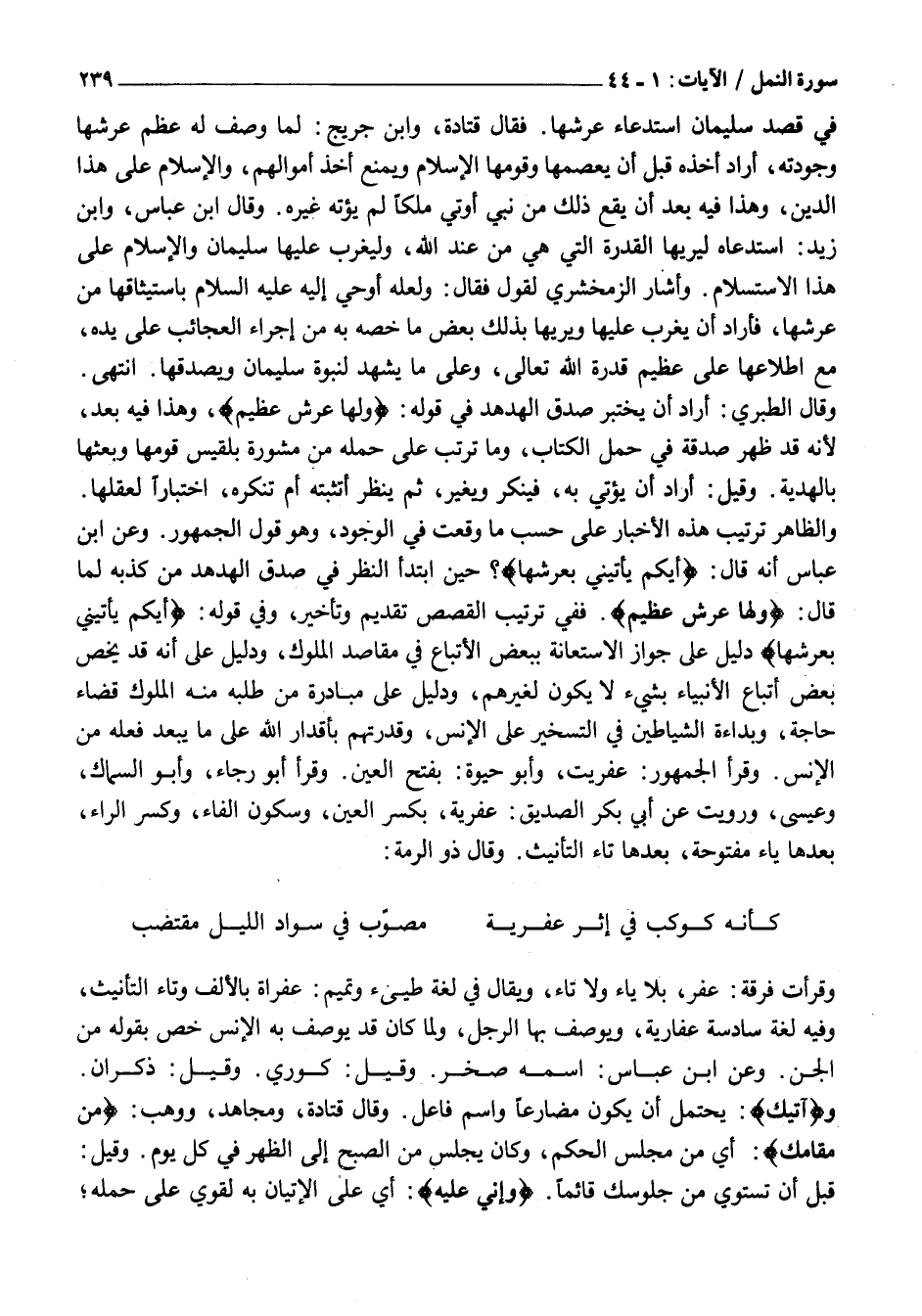 وَالظَّاهِرُ تَرْتِيبُ هَذِهِ الْأَخْبَارِ عَلَى حَسْبِ مَا وَقَعَتْ فِي الْوُجُودِ، وَهُوَ قَوْلِ الْجُمْهُورِ. وَعَنِ ابْنِ عَبَّاسٍ أَنَّهُ قَالَ: أَيُّكُمْ يَأْتِينِي بِعَرْشِها؟ حِينَ ابْتَدَأَ النَّظَرَ فِي صِدْقِ الْهُدْهُدِ مِنْ كَذِبِهِ لِمَا قَالَ: وَلَها عَرْشٌ عَظِيمٌ. فَفِي تَرْتِيبِ الْقَصَصِ تَقْدِيمٌ وَتَأْخِيرٌ، وَفِي قَوْلِهِ: أَيُّكُمْ يَأْتِينِي بِعَرْشِها دَلِيلٌ عَلَى جَوَازِ الِاسْتِعَانَةِ بِبَعْضِ الْأَتْبَاعِ فِي مَقَاصِدِ الْمُلُوكِ، وَدَلِيلٌ عَلَى أَنَّهُ قَدْ يُخَصُّ بَعْضُ أَتْبَاعِ الْأَنْبِيَاءِ بِشَيْءٍ لَا يَكُونُ لِغَيْرِهِمْ، وَدَلِيلٌ عَلَى مبادرة من طلبه مِنْهُ الْمُلُوكُ قَضَاءَ حَاجَةٍ، وَبَدَاءَةِ الشَّيَاطِينِ فِي التَّسْخِيرِ عَلَى الْإِنْسِ، وَقُدْرَتِهِمْ بِأَقْدَارِ اللَّهِ عَلَى مَا يَبْعُدُ فِعْلُهُ مِنَ الْإِنْسِ. وَقَرَأَ الْجُمْهُورُ: عِفْرِيتٌ، وَأَبُو حَيْوَةَ: بِفَتْحِ الْعَيْنِ. وَقَرَأَ أَبُو رَجَاءٍ، وَأَبُو السَّمَّاكِ، وَعِيسَى، وَرُوِيَتْ عَنْ أَبِي بَكْرٍ الصِّدِّيقِ: عِفْرِيَةٌ، بِكَسْرِ الْعَيْنِ، وَسُكُونِ الْفَاءِ، وَكَسْرِ الرَّاءِ، بَعْدَهَا يَاءٌ مَفْتُوحَةٍ، بَعْدَهَا تَاءُ التَّأْنِيثِ. وَقَالَ ذُو الرُّمَّةِ: