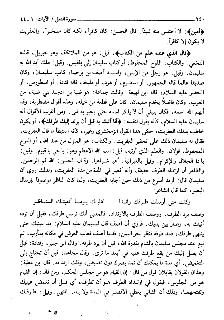 قالَ الَّذِي عِنْدَهُ عِلْمٌ مِنَ الْكِتابِ، قِيلَ: هُوَ مِنَ الْمَلَائِكَةِ، وَهُوَ جِبْرِيلُ، قَالَهُ النَّخَعِيُّ. وَالْكِتَابُ: اللَّوْحُ الْمَحْفُوظُ، أَوْ كِتَابُ سُلَيْمَانَ إِلَى بِلْقِيسَ. وَقِيلَ: مَلَكٌ أَيَّدَ اللَّهُ بِهِ سُلَيْمَانَ. وَقِيلَ: هُوَ رَجُلٌ مِنْ الْإِنْسِ، وَاسْمُهُ آصَفُ بْنُ بَرْخِيَا، كَاتِبُ سُلَيْمَانَ، وَكَانَ صِدِّيقًا عَالِمًا قَالَهُ الجمهور. أو اسطوم، أَوْ هُودٌ، أَوْ مَلِيخَا، قَالَهُ قَتَادَةُ. أَوْ أَسْطُورُسُ، أَوِ الْخَضِرُ عَلَيْهِ السَّلَامُ، قَالَهُ ابْنُ لَهِيعَةَ. وَقَالَتْ جَمَاعَةٌ: هُوَ ضَبَّةُ بْنُ ادجد بَنِي ضَبَّةَ، مِنَ الْعَرَبِ، وَكَانَ فَاضِلًا يَخْدُمُ سُلَيْمَانَ، كَانَ عَلَى قِطْعَةٍ مِنْ خَيْلِهِ، وَهَذِهِ أَقْوَالٌ مُضْطَرِبَةٌ، وَقَدْ أَبْهَمَ اللَّهُ اسْمَهُ، فَكَانَ يَنْبَغِي أَنْ لَا يُذْكَرَ اسْمُهُ حَتَّى يُخْبِرَ بِهِ نَبِيٌّ. وَمِنْ أَغْرَبِ الْأَقْوَالِ أَنَّهُ سُلَيْمَانُ عَلَيْهِ السَّلَامُ، كَأَنَّهُ يَقُولُ لِنَفْسِهِ: أَنَا آتِيكَ بِهِ قَبْلَ أَنْ يَرْتَدَّ إِلَيْكَ طَرْفُكَ، أَوْ يَكُونُ خَاطَبَ بِذَلِكَ الْعِفْرِيتَ، حَكَى هَذَا الْقَوْلَ الزَّمَخْشَرِيُّ وَغَيْرُهُ، كَأَنَّهُ اسْتَبْطَأَ مَا قَالَ الْعِفْرِيتَ، فَقَالَ لَهُ سُلَيْمَانُ ذَلِكَ عَلَى تَحْقِيرِ الْعِفْرِيتِ. وَالْكِتَابُ: هُوَ الْمُنَزَّلِ مِنْ عِنْدِ اللَّهِ، أَوِ اللَّوْحُ الْمَحْفُوظُ، قَوْلَانِ. وَالْعِلْمُ الَّذِي أُوتِيَهُ، قِيلَ: اسْمُ اللَّهِ الْأَعْظَمِ وَهُوَ: يَا حَيُّ يَا قَيُّومُ. وَقِيلَ:
