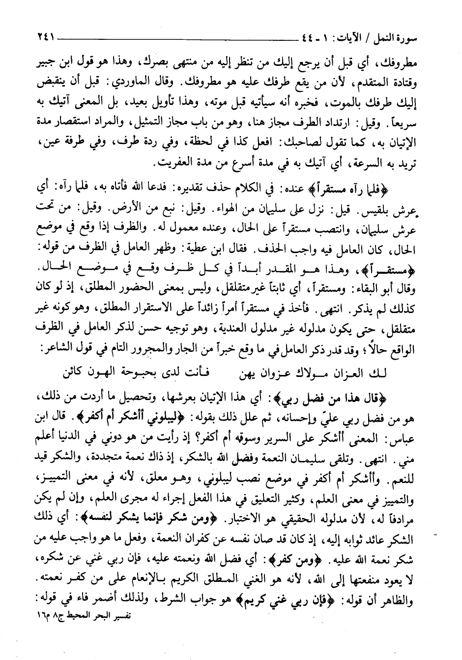 قالَ هَذَا مِنْ فَضْلِ رَبِّي: أَيْ هَذَا الْإِتْيَانُ بِعَرْشِهَا، وَتَحْصِيلُ مَا أَرَدْتُ مِنْ ذَلِكَ، هُوَ مِنْ فَضْلِ رَبِّي عَلَيَّ وَإِحْسَانِهِ، ثُمَّ عَلَّلَ ذَلِكَ بِقَوْلِهِ: لِيَبْلُوَنِي أَأَشْكُرُ أَمْ أَكْفُرُ. قَالَ ابْنُ عَبَّاسٍ: الْمَعْنَى أَأَشْكُرُ عَلَى السَّرِيرِ وَسَوْقِهِ أَمْ أَكْفُرُ؟ إِذْ رَأَيْتُ مَنْ هُوَ دُونِي فِي الدُّنْيَا أَعْلَمُ مِنِّي. انْتَهَى. وَتَلَقِّي سُلَيْمَانُ النِّعْمَةَ وَفَضْلَ اللَّهِ بِالشُّكْرِ، إِذْ ذَاكَ نِعْمَةٌ مُتَجَدِّدَةٌ، والشكر قيد للنعم. وأ أشكر أَمْ أَكْفُرُ فِي مَوْضِعِ نَصْبٍ لِيَبْلُوَنِي، وَهُوَ مُعَلَّقٌ، لِأَنَّهُ فِي مَعْنَى التَّمْيِيزِ، وَالتَّمْيِيزُ فِي مَعْنَى الْعِلْمِ، وَكَثِيرٌ التَّعْلِيقُ فِي هَذَا الْفِعْلِ إِجْرَاءً لَهُ مَجْرَى الْعِلْمِ، وَإِنْ لَمْ يَكُنْ مُرَادِفًا لَهُ، لِأَنَّ مَدْلُولَهُ الْحَقِيقِيَّ هُوَ الِاخْتِبَارُ. وَمَنْ شَكَرَ فَإِنَّما يَشْكُرُ لِنَفْسِهِ: أَيْ ذَلِكَ الشُّكْرُ عَائِدٌ ثَوَابُهُ إِلَيْهِ، إِذْ كَانَ قَدْ صَانَ نَفْسَهُ عَنْ كُفْرَانِ النِّعْمَةِ، وَفَعَلَ مَا هُوَ وَاجِبٌ عَلَيْهِ مِنْ شُكْرِ نِعْمَةِ اللَّهِ عَلَيْهِ. وَمَنْ كَفَرَ: أَيْ فَضْلَ اللَّهِ وَنِعْمَتَهُ عَلَيْهِ، فَإِنَّ رَبِّي غَنِيٌّ عَنْ شُكْرِهِ، لَا يَعُودُ مَنْفَعَتُهَا إِلَى اللَّهِ، لِأَنَّهُ هُوَ الْغَنِيُّ الْمُطْلَقُ الْكَرِيمُ بِالْإِنْعَامِ عَلَى مَنْ كَفَرَ نِعْمَتَهُ.