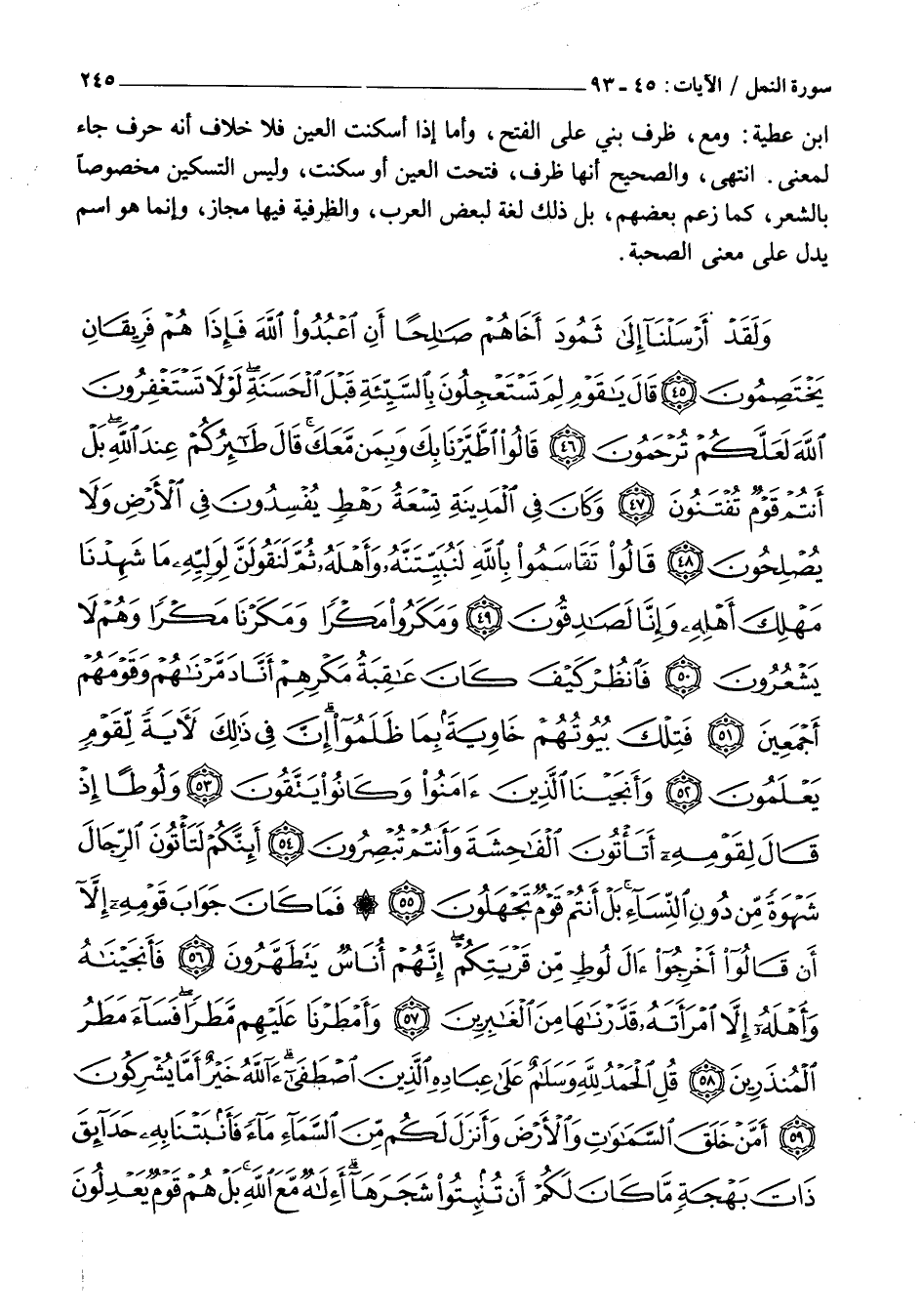 وَلَقَدْ أَرْسَلْنا إِلى ثَمُودَ أَخاهُمْ صالِحاً أَنِ اعْبُدُوا اللَّهَ فَإِذا هُمْ فَرِيقانِ يَخْتَصِمُونَ (45) قالَ يَا قَوْمِ لِمَ تَسْتَعْجِلُونَ بِالسَّيِّئَةِ قَبْلَ الْحَسَنَةِ لَوْلا تَسْتَغْفِرُونَ اللَّهَ لَعَلَّكُمْ تُرْحَمُونَ (46) قالُوا اطَّيَّرْنا بِكَ وَبِمَنْ مَعَكَ قالَ طائِرُكُمْ عِنْدَ اللَّهِ بَلْ أَنْتُمْ قَوْمٌ تُفْتَنُونَ (47) وَكانَ فِي الْمَدِينَةِ تِسْعَةُ رَهْطٍ يُفْسِدُونَ فِي الْأَرْضِ وَلا يُصْلِحُونَ (48) قالُوا تَقاسَمُوا بِاللَّهِ لَنُبَيِّتَنَّهُ وَأَهْلَهُ ثُمَّ لَنَقُولَنَّ لِوَلِيِّهِ مَا شَهِدْنا مَهْلِكَ أَهْلِهِ وَإِنَّا لَصادِقُونَ (49)