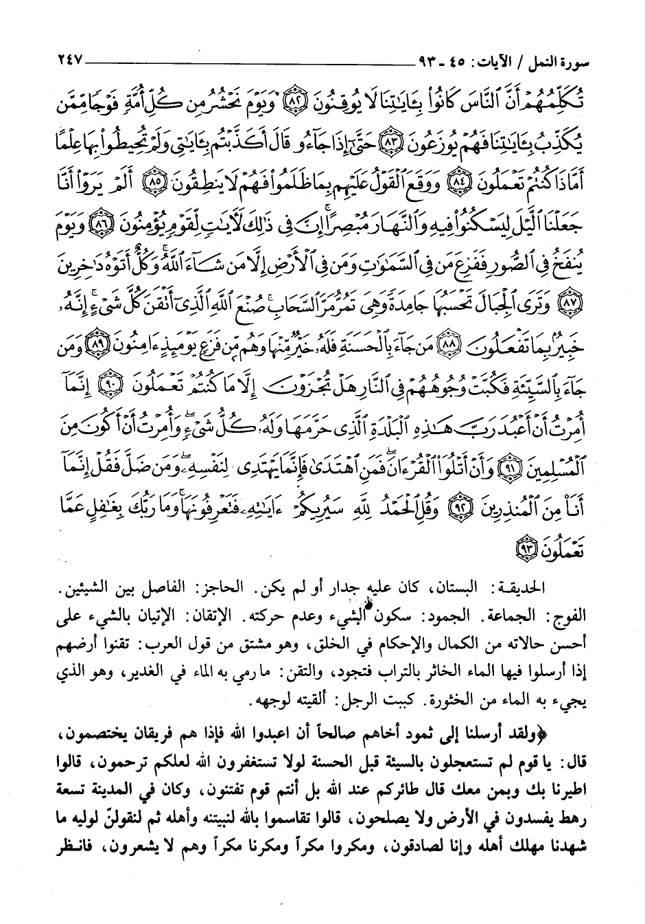 وَلَقَدْ أَرْسَلْنا إِلى ثَمُودَ أَخاهُمْ صالِحاً أَنِ اعْبُدُوا اللَّهَ فَإِذا هُمْ فَرِيقانِ يَخْتَصِمُونَ، قالَ: يَا قَوْمِ لِمَ تَسْتَعْجِلُونَ بِالسَّيِّئَةِ قَبْلَ الْحَسَنَةِ لَوْلا تَسْتَغْفِرُونَ اللَّهَ لَعَلَّكُمْ تُرْحَمُونَ، قالُوا اطَّيَّرْنا بِكَ وَبِمَنْ مَعَكَ قالَ طائِرُكُمْ عِنْدَ اللَّهِ بَلْ أَنْتُمْ قَوْمٌ تُفْتَنُونَ، وَكانَ فِي الْمَدِينَةِ تِسْعَةُ رَهْطٍ يُفْسِدُونَ فِي الْأَرْضِ وَلا يُصْلِحُونَ، قالُوا تَقاسَمُوا بِاللَّهِ لَنُبَيِّتَنَّهُ وَأَهْلَهُ ثُمَّ لَنَقُولَنَّ لِوَلِيِّهِ مَا شَهِدْنا مَهْلِكَ أَهْلِهِ وَإِنَّا لَصادِقُونَ، وَمَكَرُوا مَكْراً وَمَكَرْنا مَكْراً وَهُمْ لَا يَشْعُرُونَ، فَانْظُرْ