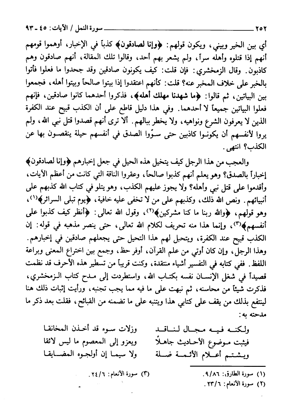 وَهَذَا الرَّجُلُ، وَإِنْ كَانَ أُوتِيَ مِنْ عِلْمِ الْقُرْآنِ، أَوْفَرَ حَظٍّ، وَجَمَعَ بَيْنَ اخْتِرَاعِ الْمَعْنَى وَبَرَاعَةِ اللَّفْظِ. فَفِي كِتَابِهِ فِي التَّفْسِيرِ أَشْيَاءَ مُنْتَقَدَةٌ، وَكُنْتُ قَرِيبًا مِنْ تَسْطِيرِ هَذِهِ الْأَحْرُفِ قَدْ نَظَمْتُ قَصِيدًا فِي شَغْلِ الْإِنْسَانِ نَفْسِهِ بِكِتَابِ اللَّهِ، وَاسْتَطْرَدْتُ إِلَى مَدْحِ كِتَابِ الزَّمَخْشَرِيِّ، فَذَكَرْتُ شَيْئًا مِنْ مَحَاسِنِهِ، ثُمَّ نَبَّهْتُ عَلَى مَا فِيهِ مِمَّا يَجِبُ تَجَنُّبُهُ، وَرَأَيْتُ إِثْبَاتَ ذَلِكَ هُنَا لِيَنْتَفِعَ بِذَلِكَ مَنْ يَقِفُ عَلَى كِتَابِي هَذَا وَيَتَنَبَّهُ عَلَى مَا تَضَمَّنَهُ مِنَ الْقَبَائِحِ، فَقُلْتُ بَعْدَ ذِكْرِ مَا مَدَحْتُهُ بِهِ: