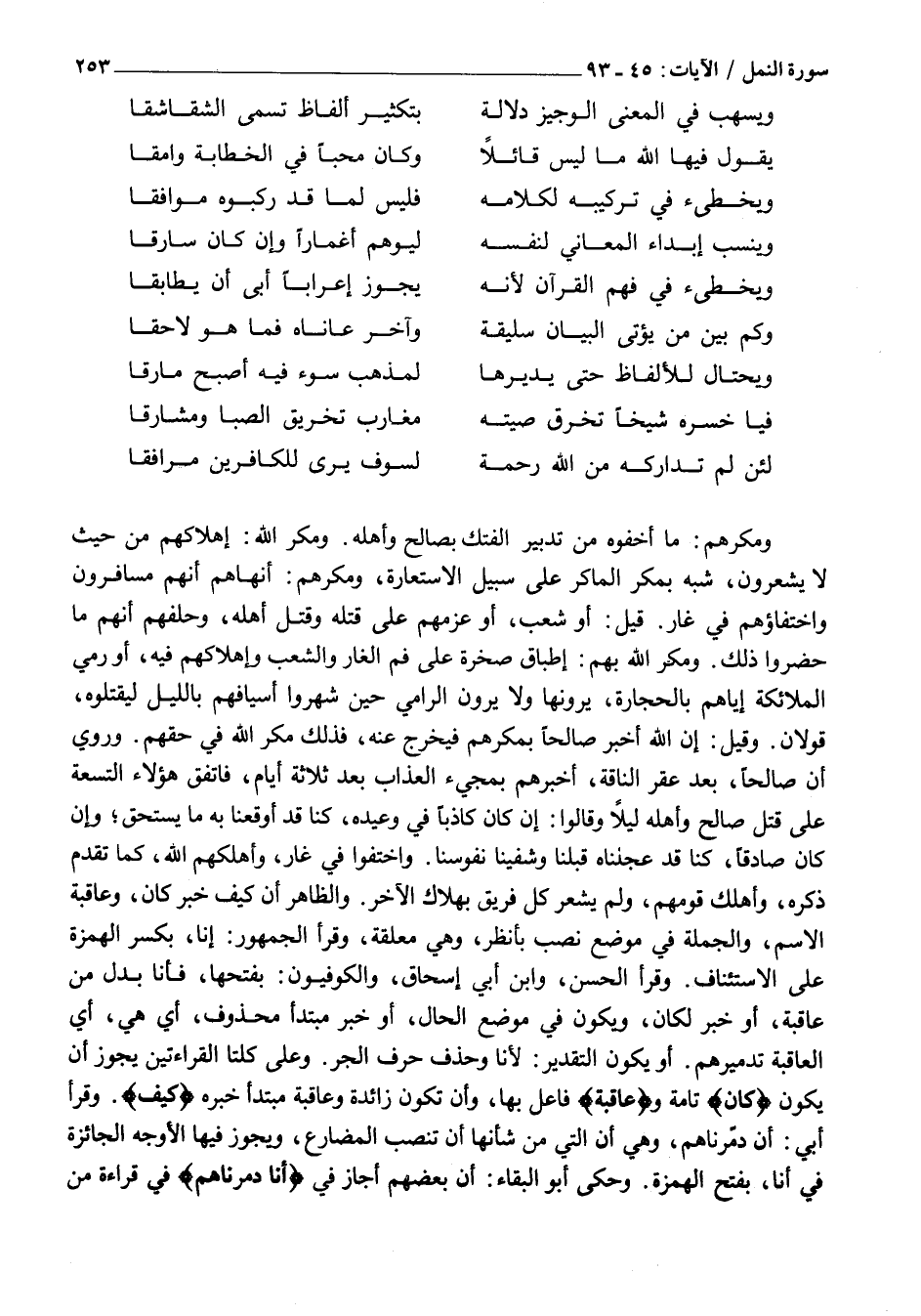 وَمَكْرُهُمْ: مَا أَخْفَوْهُ مِنْ تَدْبِيرِ الْفَتْكِ بِصَالِحٍ وَأَهْلِهِ. وَمَكْرُ اللَّهِ: إِهْلَاكُهُمْ مِنْ حَيْثُ لَا يَشْعُرُونَ، شُبِّهَ بِمَكْرِ الْمَاكِرِ عَلَى سَبِيلِ الِاسْتِعَارَةِ، وَمَكْرُهُمْ: أنهاهم أَنَّهُمْ مُسَافِرُونَ وَاخْتِفَاؤُهُمْ فِي غَارٍ. قِيلَ: أَوْ شِعْبٍ، أَوْ عَزْمُهُمْ عَلَى قَتْلِهِ وَقَتْلِ أَهْلِهِ، وَحَلِفِهِمْ أَنَّهُمْ مَا حَضَرُوا ذَلِكَ. وَمَكْرُ اللَّهِ بِهِمْ: إِطْبَاقُ صَخْرَةٍ عَلَى فَمِ الْغَارِ وَالشِّعْبِ وَإِهْلَاكُهُمْ فِيهِ، أَوْ رَمْيُ الْمَلَائِكَةِ إِيَّاهُمْ بِالْحِجَارَةِ، يَرَوْنَهَا وَلَا يَرَوْنَ الرَّامِيَ حِينَ شَهَرُوا أَسْيَافَهُمْ بِاللَّيْلِ لِيَقْتُلُوهُ، قَوْلَانِ. وَقِيلَ: إِنَّ اللَّهَ أَخْبَرَ صَالِحًا بِمَكْرِهِمْ فَيَخْرُجُ عَنْهُ، فَذَلِكَ مَكْرُ اللَّهِ فِي حَقِّهِمْ.