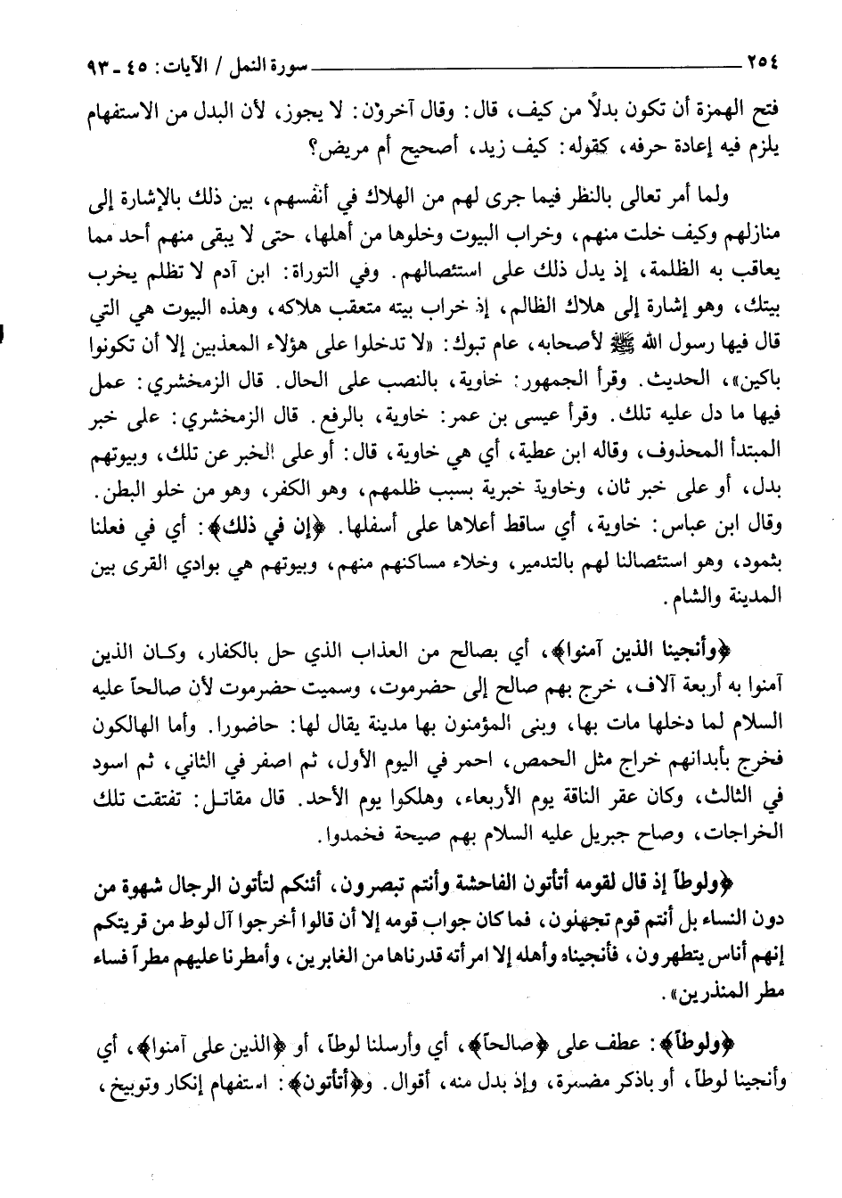 وَلُوطاً إِذْ قالَ لِقَوْمِهِ أَتَأْتُونَ الْفاحِشَةَ وَأَنْتُمْ تُبْصِرُونَ، أَإِنَّكُمْ لَتَأْتُونَ الرِّجالَ شَهْوَةً مِنْ دُونِ النِّساءِ بَلْ أَنْتُمْ قَوْمٌ تَجْهَلُونَ، فَما كانَ جَوابَ قَوْمِهِ إِلَّا أَنْ قالُوا أَخْرِجُوا آلَ لُوطٍ مِنْ قَرْيَتِكُمْ إِنَّهُمْ أُناسٌ يَتَطَهَّرُونَ، فَأَنْجَيْناهُ وَأَهْلَهُ إِلَّا امْرَأَتَهُ قَدَّرْناها مِنَ الْغابِرِينَ، وَأَمْطَرْنا عَلَيْهِمْ مَطَراً فَساءَ مَطَرُ الْمُنْذَرِينَ.