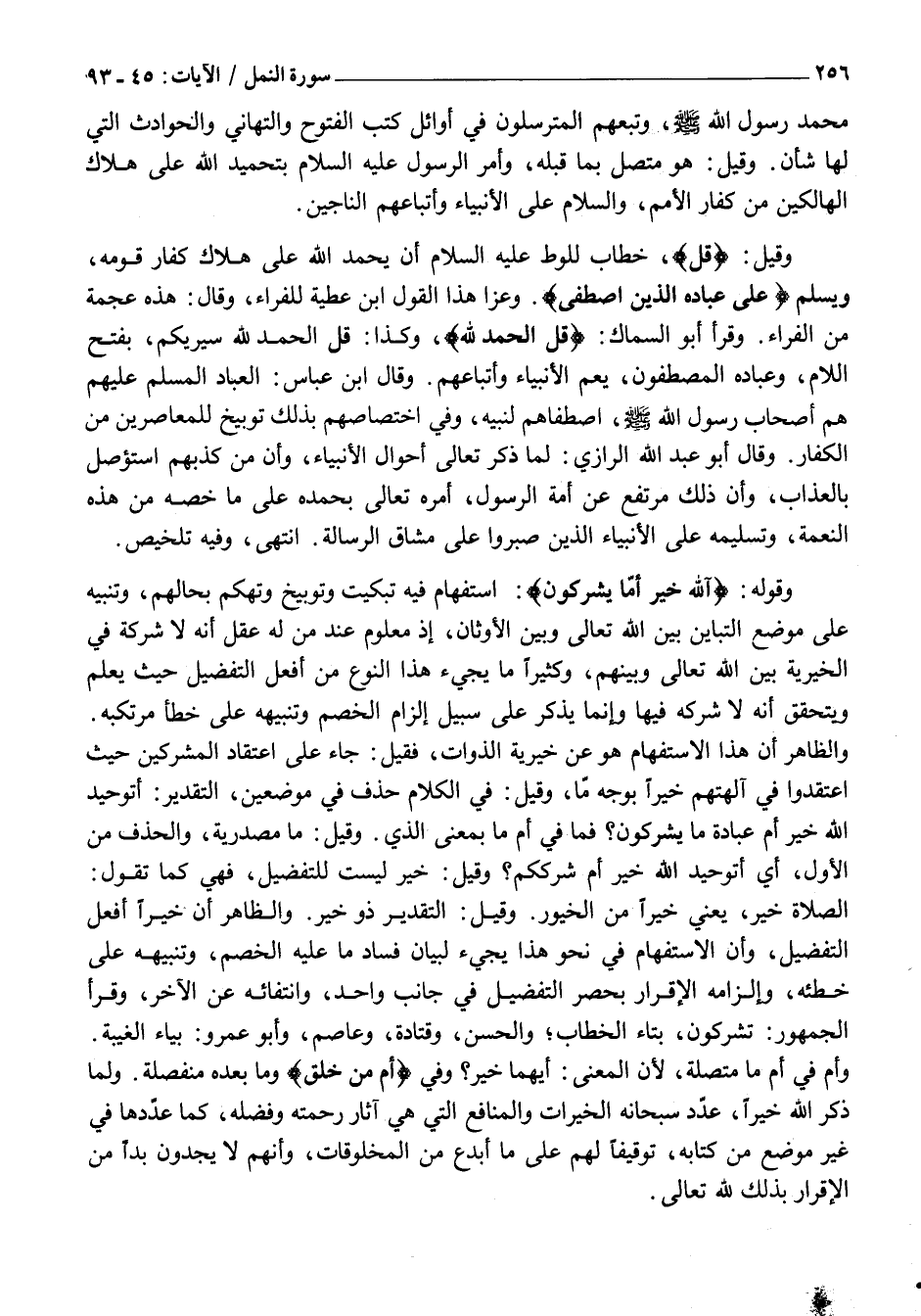 وَقِيلَ: قُلِ، خِطَابٌ لِلُوطٍ عَلَيْهِ السَّلَامُ أَنْ يَحْمَدَ اللَّهَ عَلَى هَلَاكِ كُفَّارِ قَوْمِهِ، وَيُسَلِّمُ عَلى عِبادِهِ الَّذِينَ اصْطَفى. وَعَزَا هَذَا الْقَوْلَ ابْنُ عَطِيَّةَ لِلْفَرَّاءِ، وَقَالَ: هَذِهِ عُجْمَةٌ مِنَ الْفَرَّاءِ. وَقَرَأَ أَبُو السِّمَاكِ: قُلِ الْحَمْدُ لِلَّهِ، وَكَذَا: قُلَ الْحَمْدُ لِلَّهِ سَيُرَيْكُمْ، بِفَتْحِ اللَّامِ، وَعِبَادُهُ الْمُصْطَفَوْنَ، يَعُمُّ الْأَنْبِيَاءَ وَأَتْبَاعَهُمْ. وَقَالَ ابْنُ عَبَّاسٍ: الْعِبَادُ الْمُسَلَّمُ عَلَيْهِمْ هُمْ أَصْحَابُ رَسُولِ اللَّهِ صَلَّى اللَّهُ عَلَيْهِ وَسَلَّمَ، اصْطَفَاهُمْ لِنَبِيِّهِ، وَفِي اخْتِصَاصِهِمْ بِذَلِكَ تَوْبِيخٌ لِلْمُعَاصِرِينَ مِنَ الْكُفَّارِ. وَقَالَ أَبُو عَبْدِ اللَّهِ الرَّازِيُّ: لَمَّا ذَكَرَ تَعَالَى أَحْوَالَ الْأَنْبِيَاءِ، وَأَنَّ مَنْ كَذَّبَهُمُ اسْتُؤْصِلَ بِالْعَذَابِ، وَأَنَّ ذَلِكَ مُرْتَفِعٌ عَنْ أُمَّةِ الرَّسُولِ، أَمَرَهُ تَعَالَى بِحَمْدِهِ عَلَى مَا خَصَّهُ مِنْ هَذِهِ النِّعْمَةِ، وَتَسْلِيمِهِ عَلَى الْأَنْبِيَاءِ الَّذِينَ صَبَرُوا عَلَى مَشَاقِّ الرِّسَالَةِ. انْتَهَى، وَفِيهِ تَلْخِيصٌ.
