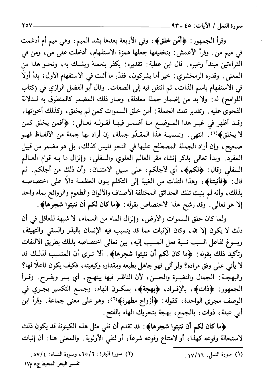 وَقَرَأَ الْجُمْهُورُ: أَمَّنْ خَلَقَ، وَفِي الْأَرْبَعَةِ بَعْدَهَا بِشَدِّ الْمِيمِ، وَهِيَ مِيمُ أَمْ أُدْغِمَتْ فِي مِيمِ مَنْ. وَقَرَأَ الْأَعْمَشُ: بِتَخْفِيفِهَا جَعَلَهَا همزة الاستفهام، أدخلت على مَنْ، وَمَنْ فِي الْقِرَاءَتَيْنِ مُبْتَدَأٌ وَخَبَرُهُ. قَالَ ابْنُ عَطِيَّةَ: تَقْدِيرُهُ: يَكْفُرُ بِنِعْمَتِهِ وَيَشُكُّ بِهِ، وَنَحْوُ هَذَا مِنَ الْمَعْنَى. وَقَدَّرَهُ الزَّمَخْشَرِيُّ: خَيْرٌ أَمَّا يُشْرِكُونَ، فَقَدَّرَ مَا أُثْبِتَ فِي الِاسْتِفْهَامِ الْأَوَّلِ بَدَأَ أَوَّلًا فِي الِاسْتِفْهَامِ بِاسْمِ الذَّاتِ، ثُمَّ انْتَقَلَ فِيهِ إِلَى الصِّفَاتِ. وَقَالَ أَبُو الْفَضْلِ الرَّازِيُّ فِي (كِتَابِ اللَّوَامِحِ) لَهُ: وَلَا بُدَّ مِنْ إِضْمَارِ جُمْلَةٍ مُعَادِلَةٍ، وَصَارَ ذَلِكَ الْمُضْمَرُ كَالْمَنْطُوقِ بِهِ لِدَلَالَةِ الْفَحْوَى عَلَيْهِ. وَتَقْدِيرُ تِلْكَ الجملة: أمن خلق السموات كَمَنْ لَمْ يَخْلُقْ، وَكَذَلِكَ أَخَوَاتُهَا، وَقَدْ أَظْهَرَ فِي غَيْرِ هَذَا الْمَوْضِعِ مَا أَضْمَرَ فِيهَا لِقَوْلِهِ تَعَالَى: أَفَمَنْ يَخْلُقُ كَمَنْ لَا يَخْلُقُ «1» . انْتَهَى. وَتَسْمِيَةُ هَذَا الْمُقَدَّرِ جُمْلَةً، إِنْ أَرَادَ بِهَا جُمْلَةً مِنَ الْأَلْفَاظِ فَهُوَ صَحِيحٌ، وَإِنْ أَرَادَ الْجُمْلَةَ الْمُصْطَلَحَ عَلَيْهَا فِي النَّحْوِ فَلَيْسَ كَذَلِكَ، بَلْ هُوَ مُضْمَرٌ مِنْ قَبِيلِ الْمُفْرَدِ. وَبَدَأَ تَعَالَى بِذِكْرِ إِنْشَاءِ مَقَرِّ الْعَالَمِ الْعُلْوِيِّ وَالسُّفْلِيِّ، وَإِنْزَالِ مَا بِهِ قِوَامُ الْعَالَمِ السُّفْلِيِّ وَقَالَ: لَكُمْ، أَيْ لِأَجْلِكُمْ، عَلَى سَبِيلِ الِامْتِنَانِ، وَأَنَّ ذَلِكَ مِنْ أَجْلِكُمْ. ثُمَّ قَالَ: فَأَنْبَتْنا، وَهَذَا الْتِفَاتٌ مِنَ الْغَيْبَةِ إِلَى التَّكَلُّمِ بِنُونِ الْعَظَمَةِ دَالًّا عَلَى اخْتِصَاصِهِ بِذَلِكَ، وَأَنَّهُ لَمْ يُنْبِتْ تِلْكَ الْحَدَائِقَ الْمُخْتَلِفَةَ الْأَصْنَافِ وَالْأَلْوَانِ وَالطَّعُومِ وَالرَّوَائِحِ بِمَاءٍ وَاحِدٍ إِلَّا هُوَ تَعَالَى. وَقَدْ رُشِّحَ هَذَا الِاخْتِصَاصُ بِقَوْلِهِ: مَا كانَ لَكُمْ أَنْ تُنْبِتُوا شَجَرَها.