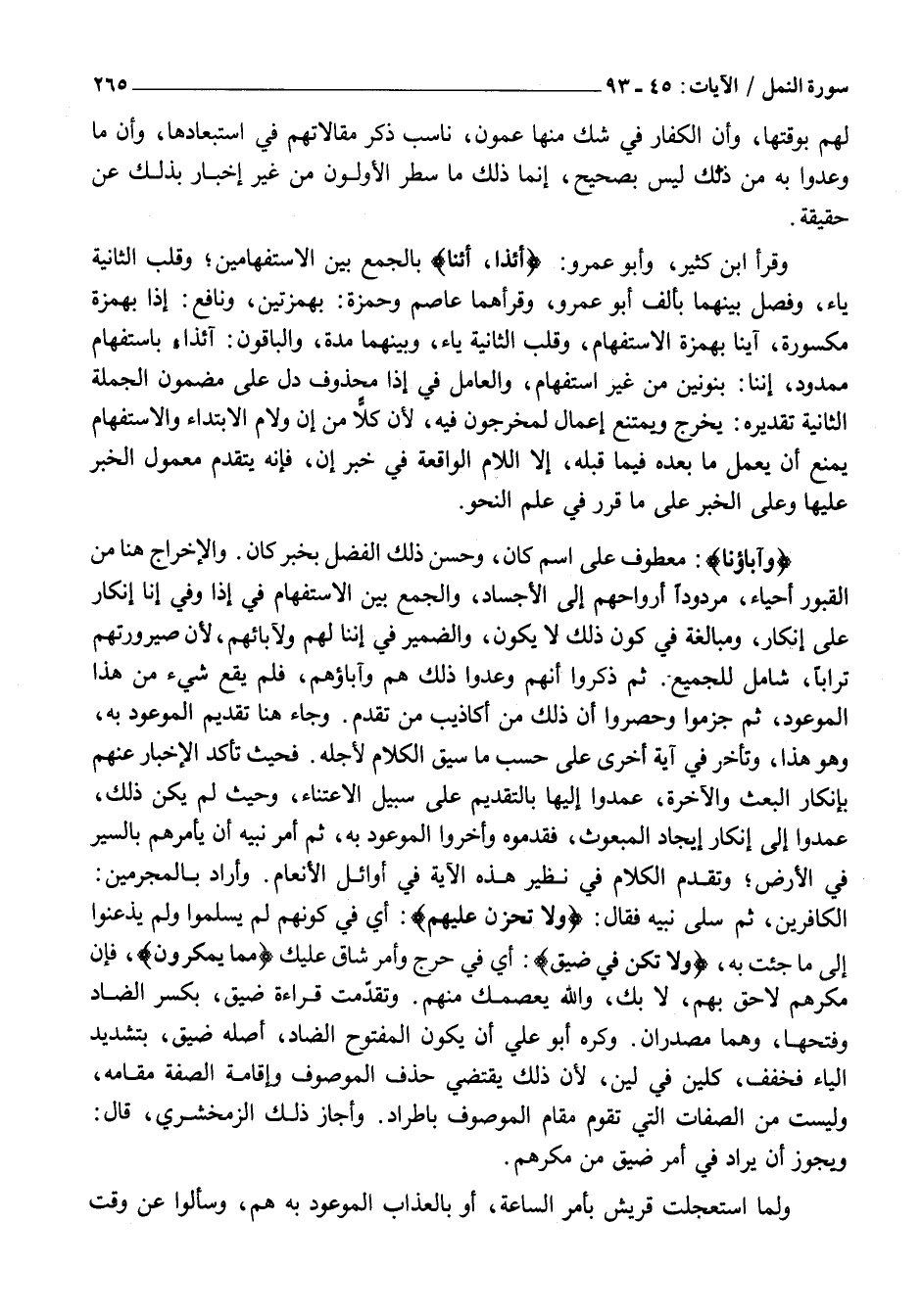 وَقَرَأَ ابْنُ كَثِيرٍ، وَأَبُو عمرو: أَإِذا، أَإِنَّا بِالْجَمْعِ بَيْنَ الِاسْتِفْهَامَيْنِ وَقَلْبِ الثَّانِيَةِ يَاءً، وَفَصَلَ بَيْنَهُمَا بِأَلِفٍ أَبُو عَمْرٍو، وَقَرَأَهُمَا عَاصِمٌ وَحَمْزَةُ: بِهَمْزَتَيْنِ، وَنَافِعٌ: إِذَا بِهَمْزَةٍ مَكْسُورَةٍ، آيِنَّا بِهَمْزَةِ الِاسْتِفْهَامِ، وَقَلْبِ الثَّانِيَةِ يَاءً، وَبَيْنَهُمَا مَدَّةٌ، وَالْبَاقُونَ: آئِذَا، بِاسْتِفْهَامٍ مَمْدُودٍ، إِنَّنَا: بِنُونَيْنِ مِنْ غَيْرِ اسْتِفْهَامٍ، وَالْعَامِلُ فِي إِذَا مَحْذُوفٌ دَلَّ عَلَى مَضْمُونِ الْجُمْلَةِ الثَّانِيَةِ تَقْدِيرُهُ: يَخْرُجُ وَيَمْتَنِعُ إِعْمَالُ لَمُخْرَجُونَ فِيهِ، لِأَنَّ كلّا من إن ولام الِابْتِدَاءِ وَالِاسْتِفْهَامِ يَمْنَعُ أَنْ يَعْمَلَ مَا بَعْدَهُ فِيمَا قَبْلَهُ، إِلَّا اللَّامَ الْوَاقِعَةَ فِي خَبَرِ إِنَّ، فَإِنَّهُ يَتَقَدَّمُ مَعْمُولُ الْخَبَرِ عَلَيْهَا وَعَلَى الْخَبَرِ عَلَى مَا قُرِّرَ فِي عِلْمِ النَّحْوِ.