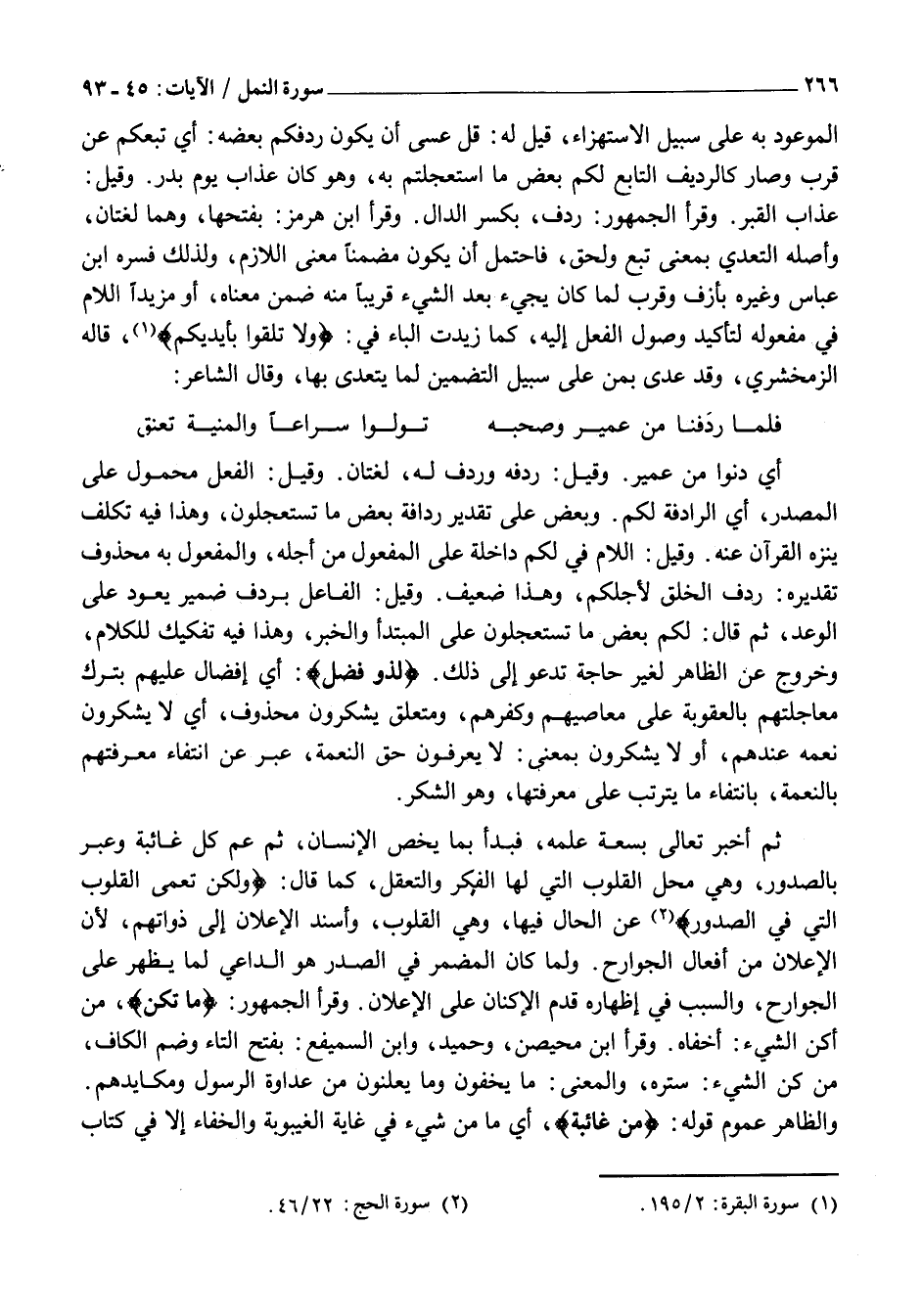 أَيْ دَنَوْا مِنْ عُمَيْرٍ. وَقِيلَ: رَدِفَهُ وَرَدِفَ لَهُ، لُغَتَانِ. وَقِيلَ: الْفِعْلُ مَحْمُولٌ عَلَى الْمَصْدَرِ، أَيِ الرَّادِفَةُ لكم. وبعض عَلَى تَقْدِيرِ رِدَافَةِ بَعْضِ مَا تَسْتَعْجِلُونَ، وَهَذَا فِيهِ تَكَلُّفٌ يُنَزَّهُ الْقُرْآنُ عَنْهُ. وَقِيلَ: اللَّامُ فِي لَكُمْ دَاخِلَةٌ عَلَى الْمَفْعُولِ مِنْ أَجْلِهِ، وَالْمَفْعُولُ بِهِ مَحْذُوفٌ تَقْدِيرُهُ: رَدِفَ الْخَلْقَ لِأَجْلِكُمْ، وَهَذَا ضَعِيفٌ. وَقِيلَ: الْفَاعِلُ بِرَدِفَ ضَمِيرٌ يَعُودُ عَلَى الْوَعْدِ، ثُمَّ قَالَ: لَكُمْ بَعْضُ مَا تَسْتَعْجِلُونَ عَلَى الْمُبْتَدَأِ وَالْخَبَرِ، وَهَذَا فِيهِ تَفْكِيكٌ لِلْكَلَامِ، وَخُرُوجٌ عَنِ الظَّاهِرِ لِغَيْرِ حَاجَةَ تَدْعُو إِلَى ذَلِكَ. لَذُو فَضْلٍ: أَيْ أَفْضَالٍ عَلَيْهِمْ بِتَرْكِ مُعَاجَلَتِهِمْ بِالْعُقُوبَةِ عَلَى مَعَاصِيهِمْ وَكُفْرِهِمْ، وَمُتَعَلِّقُ يَشْكُرُونَ مَحْذُوفٌ، أَيْ لَا يَشْكُرُونَ نِعَمَهُ عِنْدَهُمْ، أَوْ لَا يَشْكُرُونَ بِمَعْنَى: لَا يَعْرِفُونَ حَقَّ النِّعْمَةِ، عَبَّرَ عَنِ انْتِفَاءِ مَعْرِفَتِهِمْ بِالنِّعْمَةِ، بِانْتِفَاءِ مَا يَتَرَتَّبُ عَلَى مَعْرِفَتِهَا، وَهُوَ الشُّكْرُ.