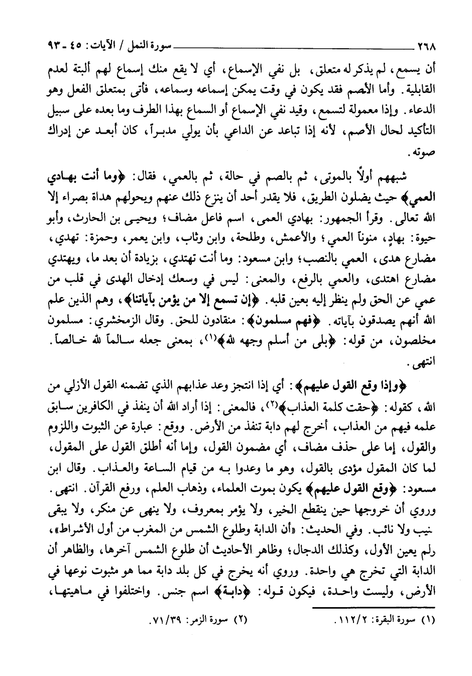 شَبَّهَهُمْ أَوَّلًا بِالْمَوْتَى، ثُمَّ بِالصُّمِّ فِي حَالَةٍ، ثُمَّ بِالْعَمَى، فَقَالَ: وَما أَنْتَ بِهادِي الْعُمْيِ حَيْثُ يَضِلُّونَ الطَّرِيقَ، فَلَا يَقْدِرُ أَحَدٌ أَنْ يَنْزِعَ ذَلِكَ عَنْهُمْ وَيُحَوِّلَهُمْ هُدَاةً بُصَرَاءَ إِلَّا اللَّهِ تَعَالَى. وَقَرَأَ الْجُمْهُورُ: بِهَادِي الْعُمْيِ، اسْمُ فَاعِلٍ مُضَافٌ وَيَحْيَى بْنُ الْحَارِثِ، وَأَبُو حَيْوَةَ: بِهَادٍ، مُنَوَّنًا الْعُمْيَ وَالْأَعْمَشُ، وَطَلْحَةُ، وَابْنُ وَثَّابٍ، وَابْنُ يَعْمُرَ، وَحَمْزَةُ: تَهْدِي، مُضَارِعُ هَدَى، الْعُمْيَ بِالنَّصْبِ وَابْنُ مَسْعُودٍ: وَمَا أَنْتَ تَهْتَدِي، بِزِيَادَةِ أَنْ بَعْدَ مَا، وَيَهْتَدِي مُضَارِعُ اهْتَدَى، وَالْعُمْيُ بِالرَّفْعِ، وَالْمَعْنَى: لَيْسَ فِي وُسْعِكَ إِدْخَالُ الْهُدَى فِي قَلْبِ مَنْ عَمِيَ عَنِ الْحَقِّ وَلَمْ يَنْظُرْ إِلَيْهِ بِعَيْنِ قَلْبِهِ. إِنْ تُسْمِعُ إِلَّا مَنْ يُؤْمِنُ بِآياتِنا، وَهُمُ الَّذِينَ عَلِمَ اللَّهُ أَنَّهُمْ يُصَدِّقُونَ بِآيَاتِهِ. فَهُمْ مُسْلِمُونَ: مُنْقَادُونَ لِلْحَقِّ. وَقَالَ الزَّمَخْشَرِيُّ: مُسْلِمُونَ مُخْلِصُونَ، مِنْ قَوْلِهِ: بَلى مَنْ أَسْلَمَ وَجْهَهُ لِلَّهِ «1» ، بِمَعْنَى جَعَلَهُ سَالِمًا لِلَّهِ خَالِصًا.