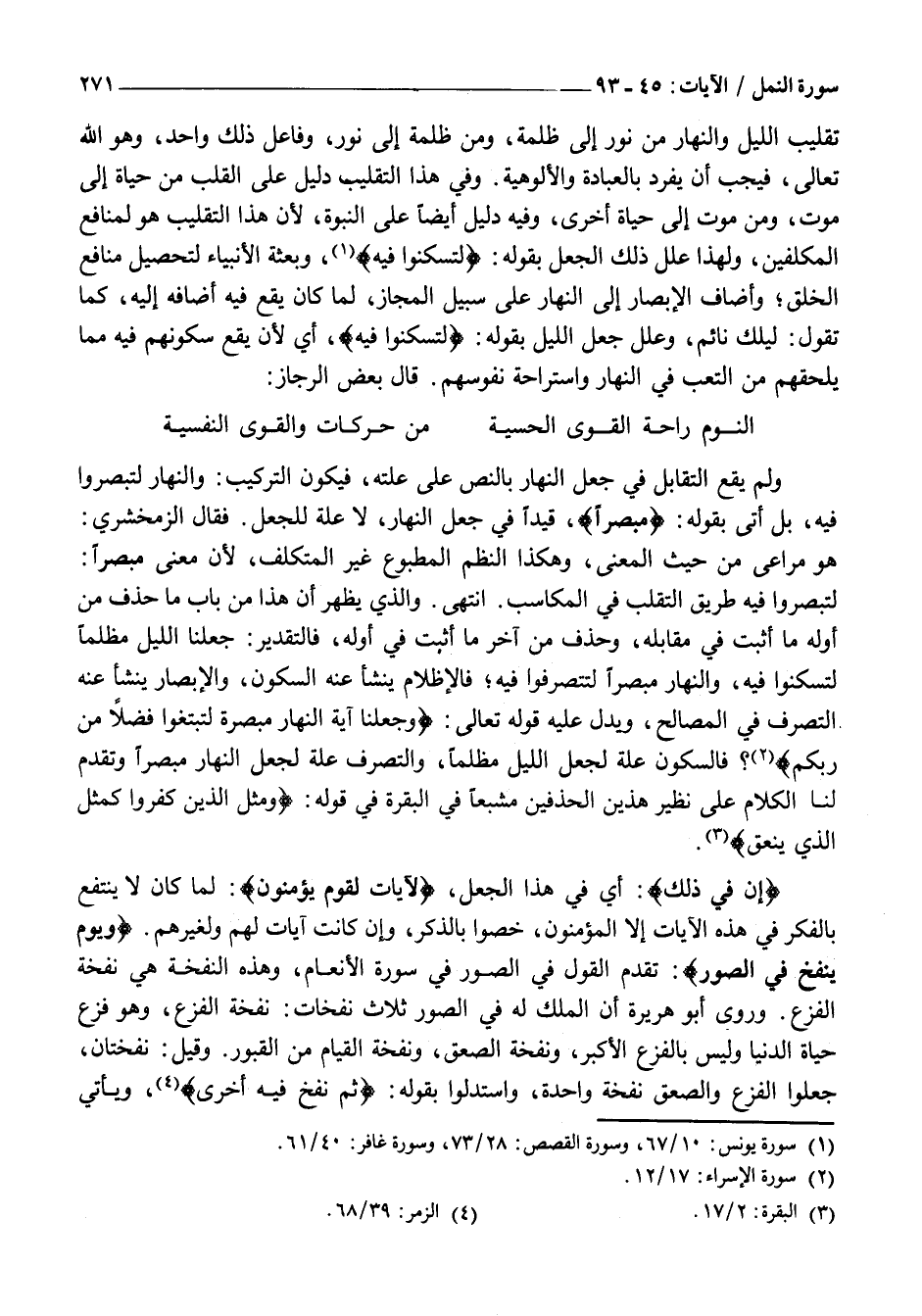 إِنَّ فِي ذلِكَ: أَيَ فِي هَذَا الْجَعْلِ، لَآياتٍ لِقَوْمٍ يُؤْمِنُونَ: لَمَّا كَانَ لَا يَنْتَفِعُ بِالْفِكْرِ فِي هَذِهِ الْآيَاتِ إِلَّا الْمُؤْمِنُونَ، خُصُّوا بِالذِّكْرِ، وَإِنْ كَانَتْ آيَاتٍ لَهُمْ وَلِغَيْرِهِمْ. وَيَوْمَ يُنْفَخُ فِي الصُّورِ: تَقَدَّمَ الْقَوْلُ فِي الصُّورِ فِي سُورَةِ الْأَنْعَامِ، وَهَذِهِ النَّفْخَةُ هِيَ نَفْخَةُ الْفَزَعِ. وَرَوَى أَبُو هُرَيْرَةَ أَنَّ الْمَلَكَ لَهُ فِي الصُّوَرِ ثَلَاثُ نَفَخَاتٍ: نَفْخَةُ الْفَزَعِ، وَهُوَ فَزَعُ حَيَاةِ الدُّنْيَا وَلَيْسَ بِالْفَزَعِ الْأَكْبَرِ، وَنَفْخَةُ الصَّعْقِ، وَنَفْخَةُ الْقِيَامِ مِنَ الْقُبُورِ. وَقِيلَ: نَفْخَتَانِ، جَعَلُوا الْفَزَعَ وَالصَّعْقَ نَفْخَةً وَاحِدَةً، وَاسْتَدَلُّوا بِقَوْلِهِ: ثُمَّ نُفِخَ فِيهِ أُخْرى «4» ، ويأتي