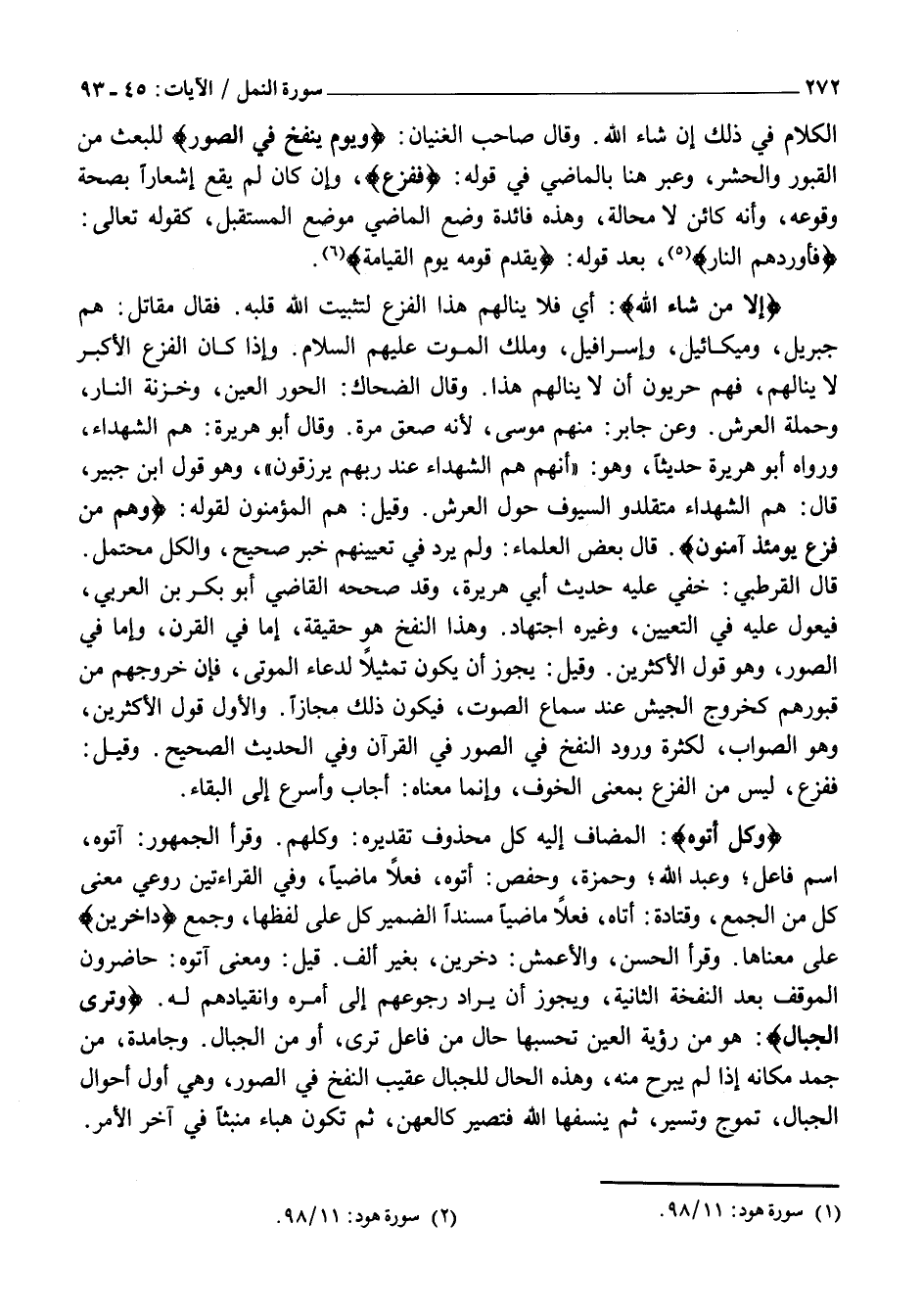 الْكَلَامُ فِي ذَلِكَ إِنْ شَاءَ اللَّهُ. وَقَالَ صَاحِبُ الْغُنْيَانِ: وَيَوْمَ يُنْفَخُ فِي الصُّورِ لِلْبَعْثِ مِنَ الْقُبُورِ وَالْحَشْرِ، وَعُبِّرَ هُنَا بِالْمَاضِي فِي قَوْلِهِ: فَفَزِعَ، وَإِنْ كَانَ لَمْ يَقَعْ إِشْعَارًا بِصِحَّةِ وُقُوعِهِ، وَأَنَّهُ كَائِنٌ لَا مَحَالَةَ، وَهَذِهِ فَائِدَةُ وَضْعِ الْمَاضِي مَوْضِعَ الْمُسْتَقْبَلِ، كَقَوْلِهِ تَعَالَى:
