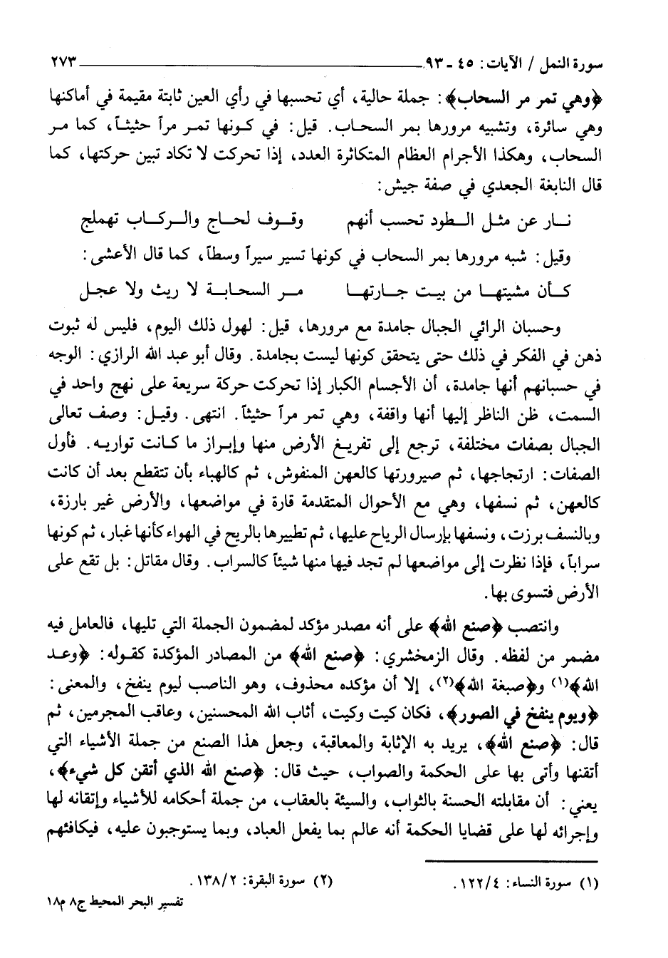 وَهِيَ تَمُرُّ مَرَّ السَّحابِ: جُمْلَةٌ حَالِيَّةٌ، أَيْ تَحْسَبُهَا فِي رَأْيِ الْعَيْنِ ثَابِتَةً مُقِيمَةً فِي أَمَاكِنِهَا وَهِيَ سَائِرَةٌ، وَتَشْبِيهُ مُرُورِهَا بِمَرِّ السَّحَابِ. قِيلَ: فِي كَوْنِهَا تَمُرُّ مَرًّا حَثِيثًا، كَمَا مَرَّ السَّحَابُ، وَهَكَذَا الْأَجْرَامُ الْعِظَامُ الْمُتَكَاثِرَةُ الْعَدَدِ، إِذَا تَحَرَّكَتْ لَا تَكَادُ تَبِينُ حَرَكَتُهَا، كَمَا قَالَ النَّابِغَةُ الْجَعْدِيُّ فِي صِفَةِ جَيْشٍ: