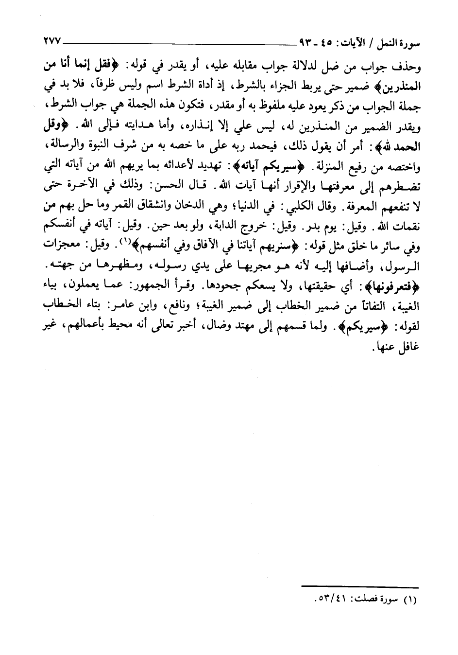 وَحُذِفَ جَوَابُ مَنْ ضَلَّ لِدَلَالَةِ جَوَابِ مُقَابِلِهِ عَلَيْهِ، أَوْ يُقَدَّرُ فِي قَوْلِهِ: فَقُلْ إِنَّما أَنَا مِنَ الْمُنْذِرِينَ ضَمِيرٌ حَتَّى يُرْبَطَ الْجَزَاءُ بِالشَّرْطِ، إِذْ أَدَاةُ الشَّرْطِ اسْمٌ وَلَيْسَ ظَرْفًا، فَلَا بُدَّ فِي جُمْلَةِ الْجَوَابِ مِنْ ذِكْرٍ يَعُودُ عَلَيْهِ مَلْفُوظٍ بِهِ أَوْ مُقَدَّرٍ، فَتَكُونُ هَذِهِ الْجُمْلَةَ هِيَ جَوَابُ الشَّرْطِ، وَيُقَدَّرُ الضَّمِيرُ مِنَ الْمُنْذِرِينَ لَهُ، لَيْسَ عَلَيَّ إِلَّا إِنْذَارُهُ، وَأَمَّا هِدَايَتُهُ فَإِلَى اللَّهِ. وَقُلِ الْحَمْدُ لِلَّهِ: أُمِرَ أَنْ يَقُولَ ذَلِكَ، فَيَحْمَدَ رَبَّهُ عَلَى مَا خَصَّهُ بِهِ مِنْ شَرَفِ النُّبُوَّةِ وَالرِّسَالَةِ، وَاخْتَصَّهُ مِنْ رَفِيعِ الْمَنْزِلَةِ. سَيُرِيكُمْ آياتِهِ: تَهْدِيدٌ لِأَعْدَائِهِ بِمَا يُرِيهِمُ اللَّهُ مِنْ آيَاتِهِ الَّتِي تَضْطَرُّهُمْ إِلَى مَعْرِفَتِهَا وَالْإِقْرَارِ أَنَّهَا آيَاتُ اللَّهِ. قَالَ الْحَسَنُ: وَذَلِكَ فِي الْآخِرَةِ حَتَّى لَا تَنْفَعَهُمُ الْمَعْرِفَةُ. وَقَالَ الْكَلْبِيُّ: فِي الدُّنْيَا وَهِيَ الدُّخَانُ وَانْشِقَاقُ الْقَمَرِ وَمَا حَلَّ بِهِمْ مِنَ نَقَمَاتِ اللَّهِ. وَقِيلَ: يَوْمُ بَدْرٍ. وَقِيلَ: خُرُوجُ الدَّابَّةِ، وَلَوْ بَعْدَ حِينٍ. وَقِيلَ: آيَاتُهُ فِي أَنْفُسِكُمْ وَفِي سَائِرِ مَا خَلَقَ مِثْلُ قَوْلِهِ: سَنُرِيهِمْ آياتِنا فِي الْآفاقِ وَفِي أَنْفُسِهِمْ «1» . وَقِيلَ: مُعْجِزَاتُ الرَّسُولِ، وَأَضَافَهَا إِلَيْهِ لِأَنَّهُ هُوَ مُجْرِيهَا عَلَى يَدَيْ رَسُولِهِ، وَمُظْهِرُهَا مِنْ جِهَتِهِ.