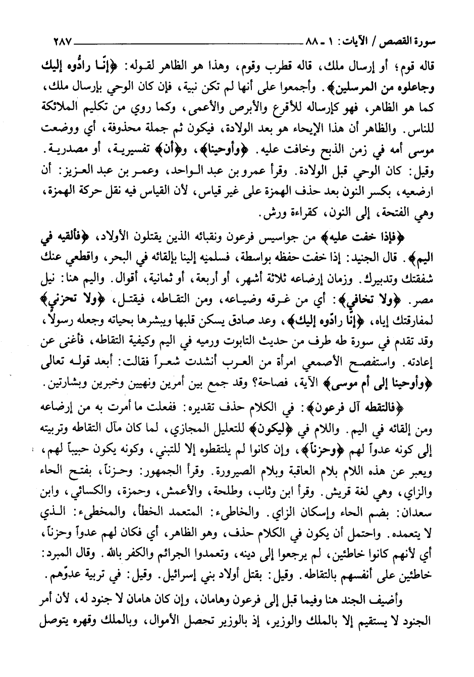 فَإِذا خِفْتِ عَلَيْهِ مِنْ جَوَاسِيسِ فِرْعَوْنَ وَنُقَبَائِهِ الَّذِينَ يَقْتُلُونَ الْأَوْلَادَ، فَأَلْقِيهِ فِي الْيَمِّ. قَالَ الْجُنَيْدُ: إِذَا خِفْتِ حِفْظَهُ بِوَاسِطَةٍ، فَسَلِّمِيهِ إِلَيْنَا بِإِلْقَائِهِ فِي الْبَحْرِ، وَاقْطَعِي عَنْكِ شَفَقَتَكِ وَتَدْبِيرَكِ. وَزَمَانُ إِرْضَاعِهِ ثَلَاثَةُ أَشْهُرٍ، أَوْ أَرْبَعَةٌ، أَوْ ثَمَانِيَةٌ، أَقْوَالٌ. وَالْيَمُّ هُنَا: نِيلُ مِصْرَ. وَلا تَخافِي: أَيْ مِنْ غَرَقِهِ وَضَيَاعِهِ، وَمِنِ الْتِقَاطِهِ، فَيُقْتَلُ، وَلا تَحْزَنِي لِمُفَارَقَتِكِ إِيَّاهُ، إِنَّا رَادُّوهُ إِلَيْكِ، وَعْدٌ صَادِقٌ يُسَكِّنُ قَلْبَهَا وَيُبَشِّرُهَا بِحَيَاتِهِ وَجَعْلِهِ رَسُولًا، وَقَدْ تَقَدَّمَ فِي سُورَةِ طه طَرَفٌ مِنْ حَدِيثِ التَّابُوتِ وَرَمْيِهِ فِي الْيَمِّ وَكَيْفِيَّةِ الْتِقَاطِهِ، فَأَغْنَى عَنْ إِعَادَتِهِ. وَاسْتَفْصَحَ الْأَصْمَعِيُّ امْرَأَةً مِنَ الْعَرَبِ أَنْشَدَتْ شِعْرًا فَقَالَتْ: أَبَعْدَ قَوْلِهِ تَعَالَى وَأَوْحَيْنا إِلى أُمِّ مُوسى الْآيَةَ، فَصَاحَةٌ؟ وَقَدْ جَمَعَ بَيْنَ أَمْرَيْنِ وَنَهْيَيْنِ وَخَبَرَيْنِ وَبِشَارَتَيْنِ.