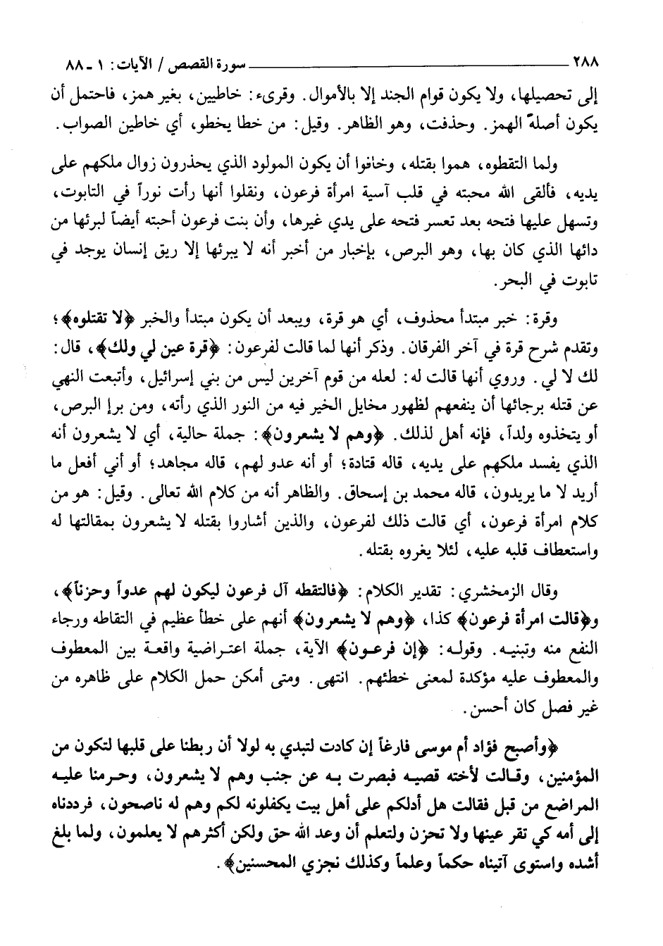 وَقَالَ الزَّمَخْشَرِيُّ: تَقْدِيرُ الْكَلَامِ: فَالْتَقَطَهُ آلُ فِرْعَوْنَ لِيَكُونَ لَهُمْ عَدُوًّا وَحَزَناً، وقالَتِ امْرَأَتُ فِرْعَوْنَ كَذَا، وَهُمْ لَا يَشْعُرُونَ أَنَّهُمْ عَلَى خَطَأٍ عَظِيمٍ فِي الْتِقَاطِهِ وَرَجَاءِ النَّفْعِ مِنْهُ وَتَبَنِّيهِ. وَقَوْلُهُ: إِنَّ فِرْعَوْنَ الْآيَةَ، جُمْلَةٌ اعْتِرَاضِيَّةٌ وَاقِعَةٌ بَيْنَ الْمَعْطُوفِ وَالْمَعْطُوفِ عَلَيْهِ مُؤَكِّدَةٌ لِمَعْنَى خَطَئِهِمْ. انْتَهَى. وَمَتَى أَمْكَنَ حَمْلُ الْكَلَامِ عَلَى ظَاهِرِهِ مِنْ غَيْرِ فَصْلٍ كَانَ أحسن.