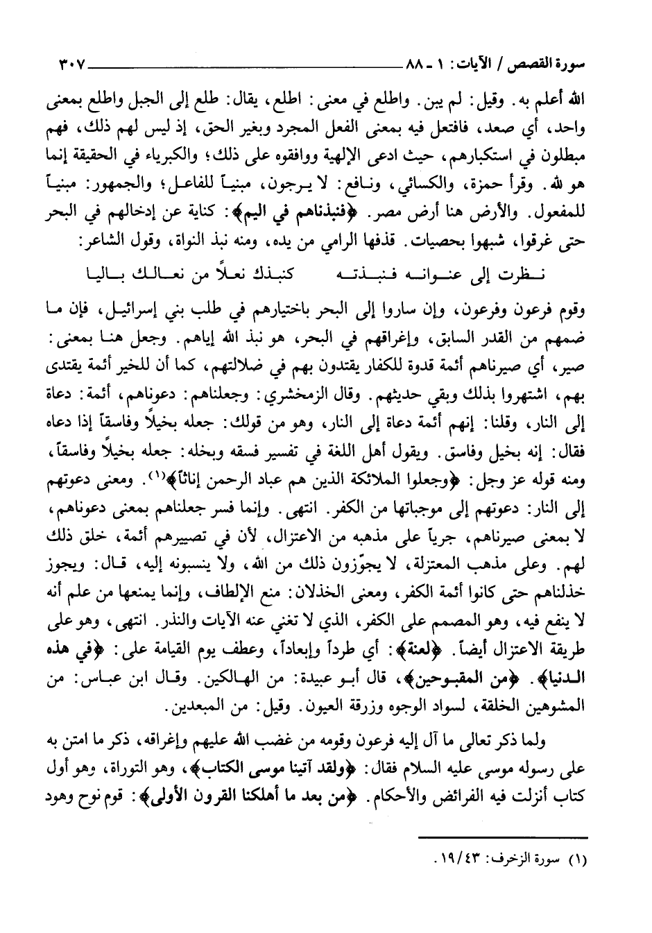 اللَّهُ أَعْلَمُ بِهِ. وَقِيلَ: لَمْ يُبْنَ. وَاطَّلَعَ فِي معنى: اطلع، يُقَالُ: طَلَعَ إِلَى الْجَبَلِ وَاطَّلَعَ بِمَعْنًى وَاحِدٍ، أَيْ صَعِدَ، فَافْتَعَلَ فِيهِ بِمَعْنَى الْفِعْلِ الْمُجَرَّدِ وَبِغَيْرِ الْحَقِّ، إِذْ لَيْسَ لَهُمْ ذَلِكَ، فَهُمْ مُبْطِلُونَ فِي اسْتِكْبَارِهِمْ، حَيْثُ ادَّعَى الْإِلَهِيَّةَ وَوَافَقُوهُ عَلَى ذَلِكَ وَالْكِبْرِيَاءُ فِي الْحَقِيقَةِ إِنَّمَا هُوَ لِلَّهِ. وَقَرَأَ حَمْزَةُ، وَالْكِسَائِيُّ، وَنَافِعٌ: لا يرجون، مَبْنِيًّا لِلْفَاعِلِ وَالْجُمْهُورُ: مَبْنِيًّا لِلْمَفْعُولِ. وَالْأَرْضِ هُنَا أَرْضُ مِصْرَ. فَنَبَذْناهُمْ فِي الْيَمِّ: كِنَايَةٌ عَنْ إِدْخَالِهِمْ فِي الْبَحْرِ حَتَّى غَرِقُوا، شُبِّهُوا بِحَصَيَاتٍ. قَذَفَهَا الرَّامِي مِنْ يَدِهِ، وَمِنْهُ نَبْذُ النَّوَاةِ، وَقَوْلُ الشَّاعِرِ: