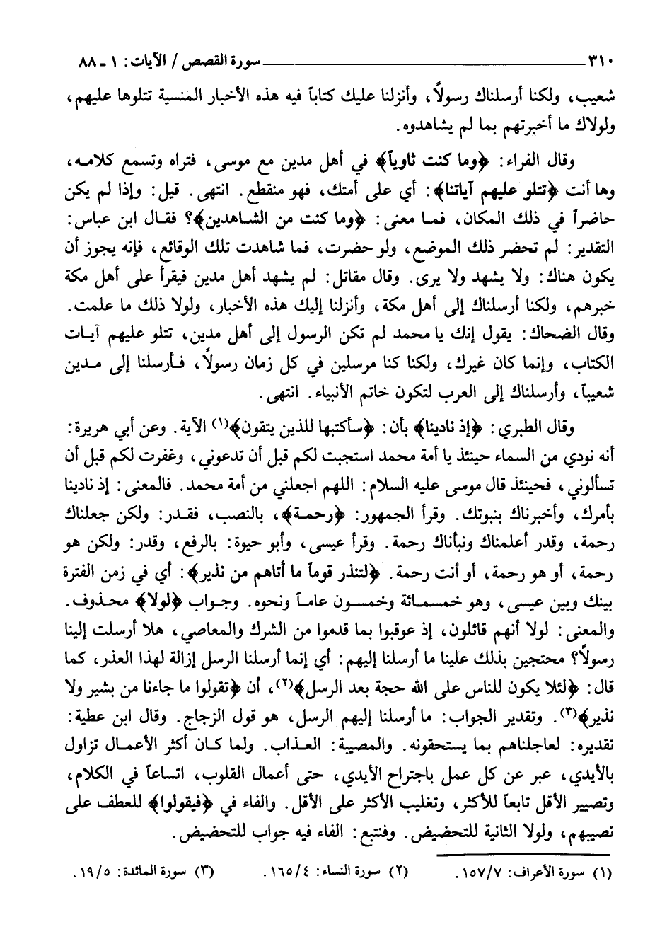 التَّقْدِيرُ: لَمْ تَحْضُرْ ذَلِكَ الْمَوْضِعَ، وَلَوْ حَضَرْتَ، فَمَا شَاهَدْتَ تِلْكَ الْوَقَائِعَ، فَإِنَّهُ يَجُوزُ أَنْ يَكُونَ هُنَاكَ: وَلَا يَشْهَدُ وَلَا يَرَى. وَقَالَ مُقَاتِلٌ: لَمْ يَشْهَدْ أَهْلَ مَدْيَنَ فَيَقْرَأُ عَلَى أَهْلِ مَكَّةَ خَبَرَهُمْ، وَلَكِنَّا أَرْسَلْنَاكَ إِلَى أَهْلِ مَكَّةَ، وَأَنْزَلْنَا إِلَيْكَ هَذِهِ الْأَخْبَارَ، وَلَوْلَا ذَلِكَ مَا عَلِمْتَ.