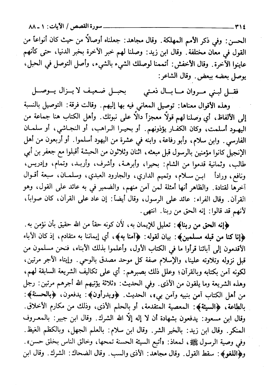 وَهَذِهِ الْأَقْوَالُ مَعْنَاهَا: تَوْصِيلُ الْمَعَانِي فِيهِ بِهَا إِلَيْهِمْ. وَقَالَتْ فِرْقَةٌ: التَّوْصِيلُ بِالنِّسْبَةِ إِلَى الْأَلْفَاظِ، أَيْ وَصَّلْنَا لَهُمْ قَوْلًا مُعْجِزًا دَالًّا عَلَى نُبُوَّتِكَ. وَأَهْلُ الْكِتَابِ هُنَا جَمَاعَةٌ مِنَ الْيَهُودِ أَسْلَمَتْ، وَكَانَ الْكُفَّارُ يُؤْذُونَهُمْ. أَوْ بَحِيرَا الرَّاهِبُ، أَوِ النَّجَاشِيُّ، أَوْ سَلْمَانُ الْفَارِسِيُّ. وَابْنُ سَلَامٍ، وَأَبُو رَفَاعَةَ، وَابْنُهُ فِي عَشَرَةٍ مِنَ الْيَهُودِ أَسْلَمُوا. أَوْ أَرْبَعُونَ مِنْ أَهْلِ الْإِنْجِيلِ كَانُوا مُؤْمِنِينَ بِالرَّسُولِ قَبْلَ مَبْعَثِهِ، اثْنَانِ وَثَلَاثُونَ مِنَ الْحَبَشَةِ أَقْبَلُوا مَعَ جَعْفَرِ بْنِ أَبِي طَالِبٍ، وَثَمَانِيَةٌ قَدِمُوا مِنَ الشَّامِ: بَحِيرَا، وَأَبْرَهَةُ، وَأَشْرَفُ، وَأَرْبَدُ، وَتَمَّامٌ، وإدريس، ونافع، وتميم وقيل ابْنُ سَلَامٍ، وَتَمِيمٌ الدَّارِيُّ، وَالْجَارُودُ الْعَبْدِيُّ، وَسَلْمَانُ، سَبْعَةُ أَقْوَالٍ آخِرُهَا لِقَتَادَةَ. وَالظَّاهِرُ أَنَّهَا أَمْثِلَةٌ لِمَنْ آمَنَ مِنْهُمْ، وَالضَّمِيرُ فِي بِهِ عَائِدٌ عَلَى الْقَوْلِ، وَهُوَ الْقُرْآنُ. وَقَالَ الْفَرَّاءُ: عَائِدٌ عَلَى الرَّسُولِ، وَقَالَ أَيْضًا: إِنْ عَادَ عَلَى الْقُرْآنِ، كَانَ صَوَابًا، لِأَنَّهُمْ قَدْ قَالُوا: إِنَّهُ الْحَقُّ مِنْ رَبِّنَا. انْتَهَى.